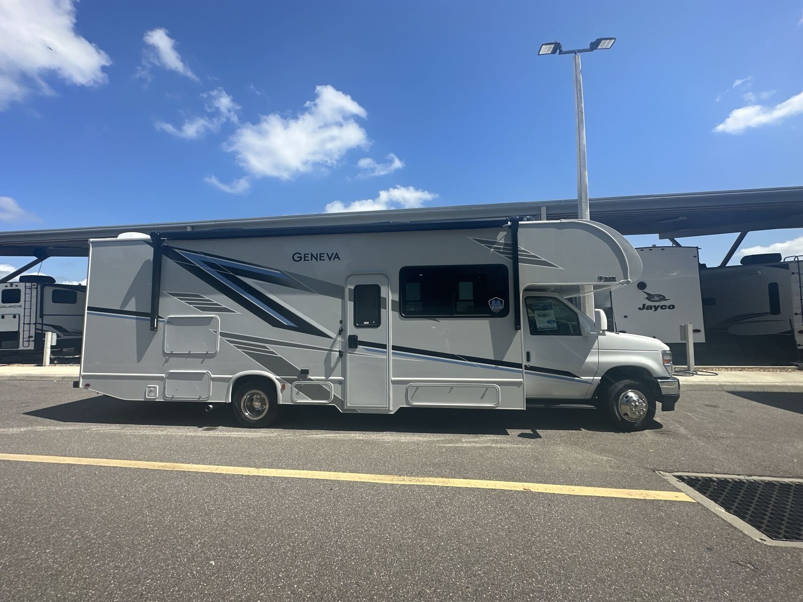 The 2025 Thor Motor Coach Geneva 29VT is a Class C motorhome designed for comfort and convenience, making it a great choice for families and travelers. At 31 feet long, the 29VT offers plenty of space while being easy to drive. Its exterior features modern graphics and a durable build. Setting up at your destination is simple with automatic leveling jacks that provide stability.