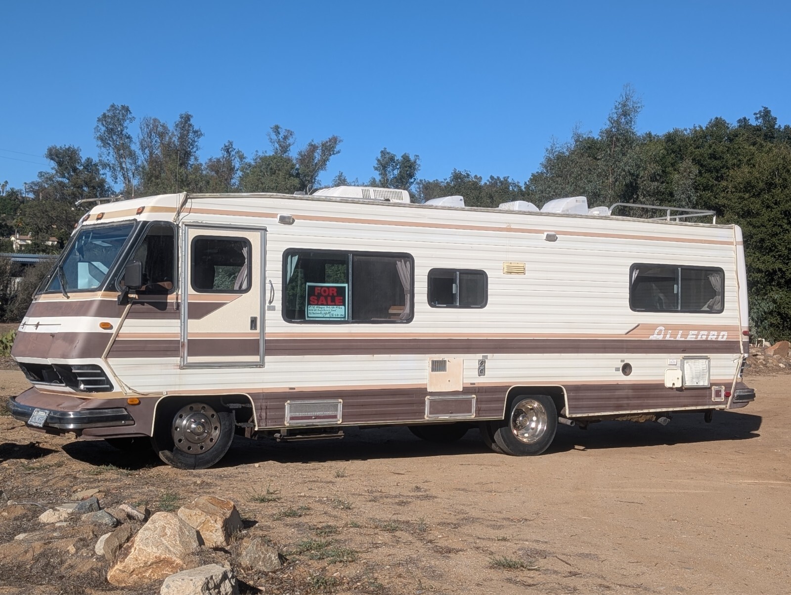 1989 30' Allegro, 41K mi. GM P30 chassis with a 454 and turbo 400. Runs and drives great. This is one of the rare ones with all aluminum construction. It has an Onan generator, 19.5 in wheels, 95% of the tread on the tires, I tested the systems, 12 Volt lighting, battery and charging is fully operational, as is generator, hot water tank. The refrigerator gets cold but not all the way cold, I haven't been able to get the furnace to start, it probably works. I just haven't looked into it. Water tank and holding tanks all seem to be in good shape. Hydraulic leveling system works but has a leak. AC system runs but not sure if it blows cold make some funny noises. Solid foundation. Frame engine transmission and suspension wheels and tires all in excellent condition. Clean Title.