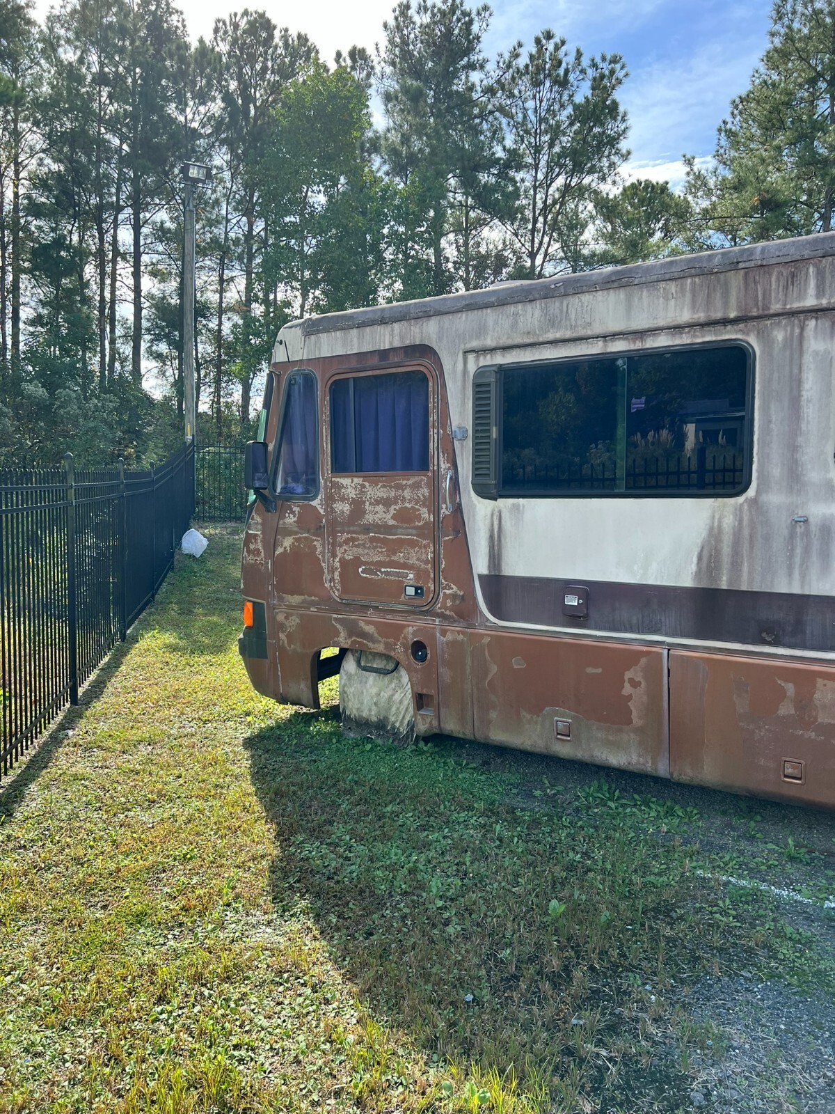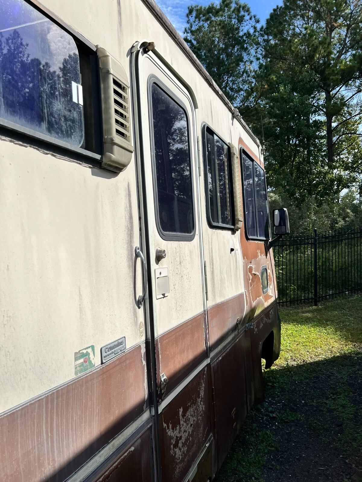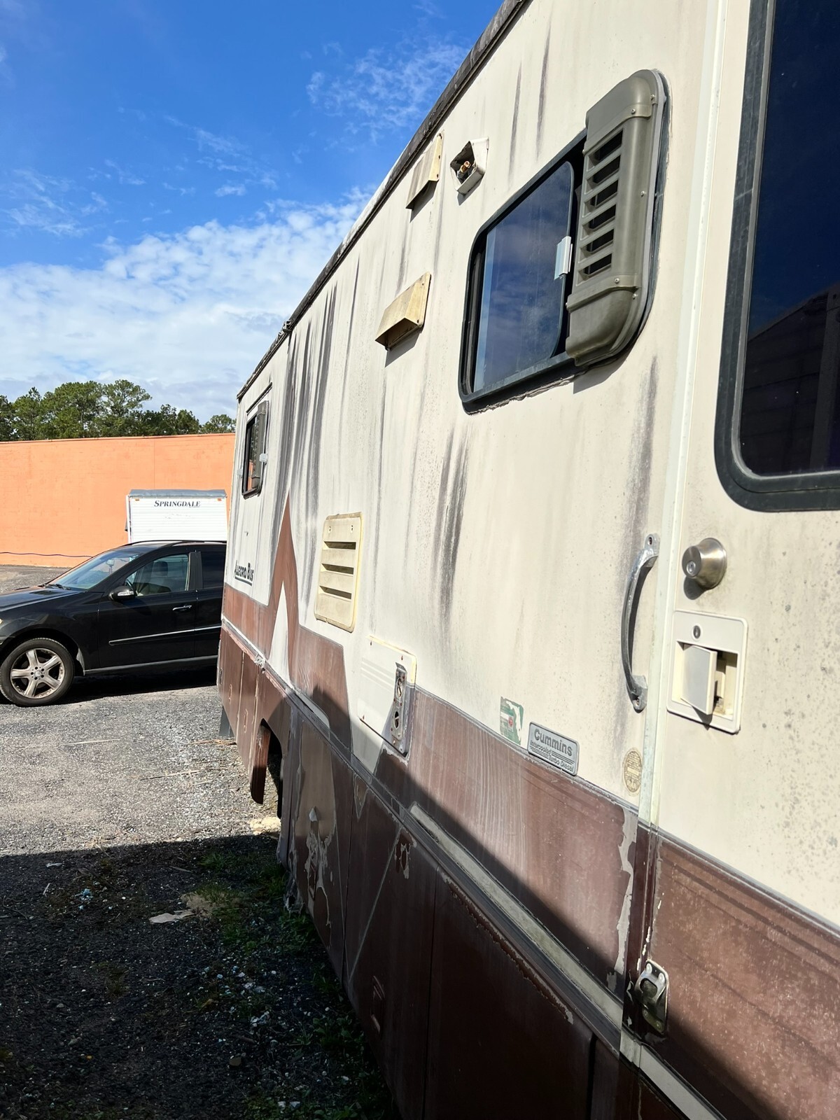 We drove her 600 miles back from Florida to Charleston, SC. She has basically been parked in gated storage since then. The roof coating failed and water got in and caused some cosmetic damage, primarily to one of the upper cabinets as you can see in the picture. There are a few other areas of water intrusion as well, but this can be repaired and is reflected heavily in the price. She has not been started in a couple of years, but the Cummins Diesel with Alison Transmission is clean and has low miles(about 36000). However she may need towed from the storage lot, but can remain there if needed. It's about $250 a month and is secured. Storage is paid through November 2025 right now and can continue.