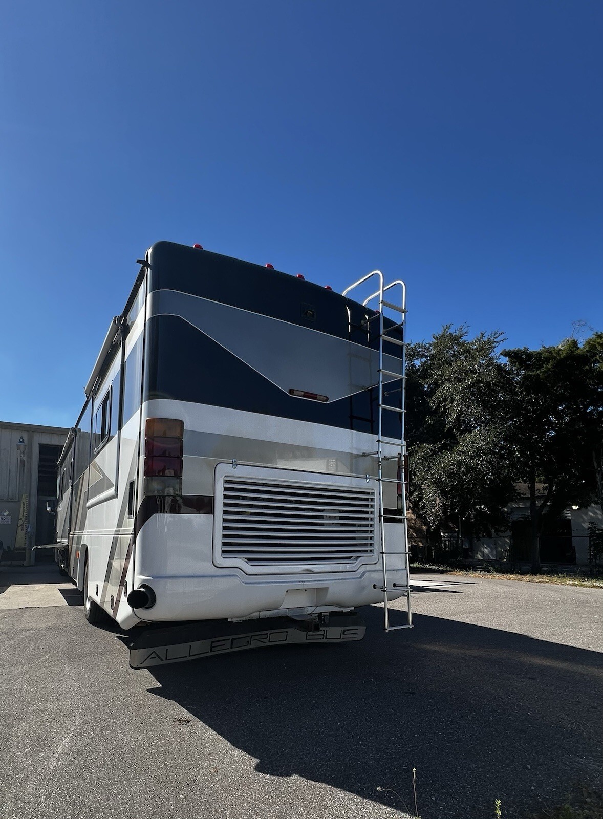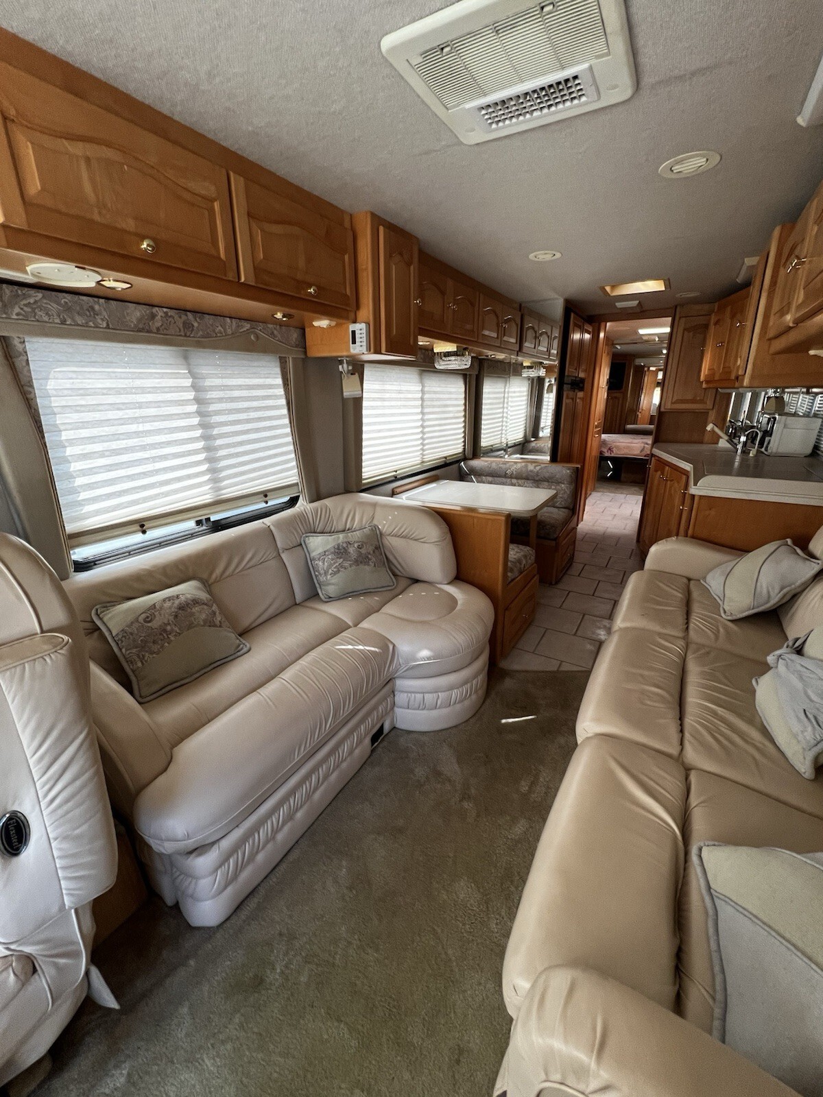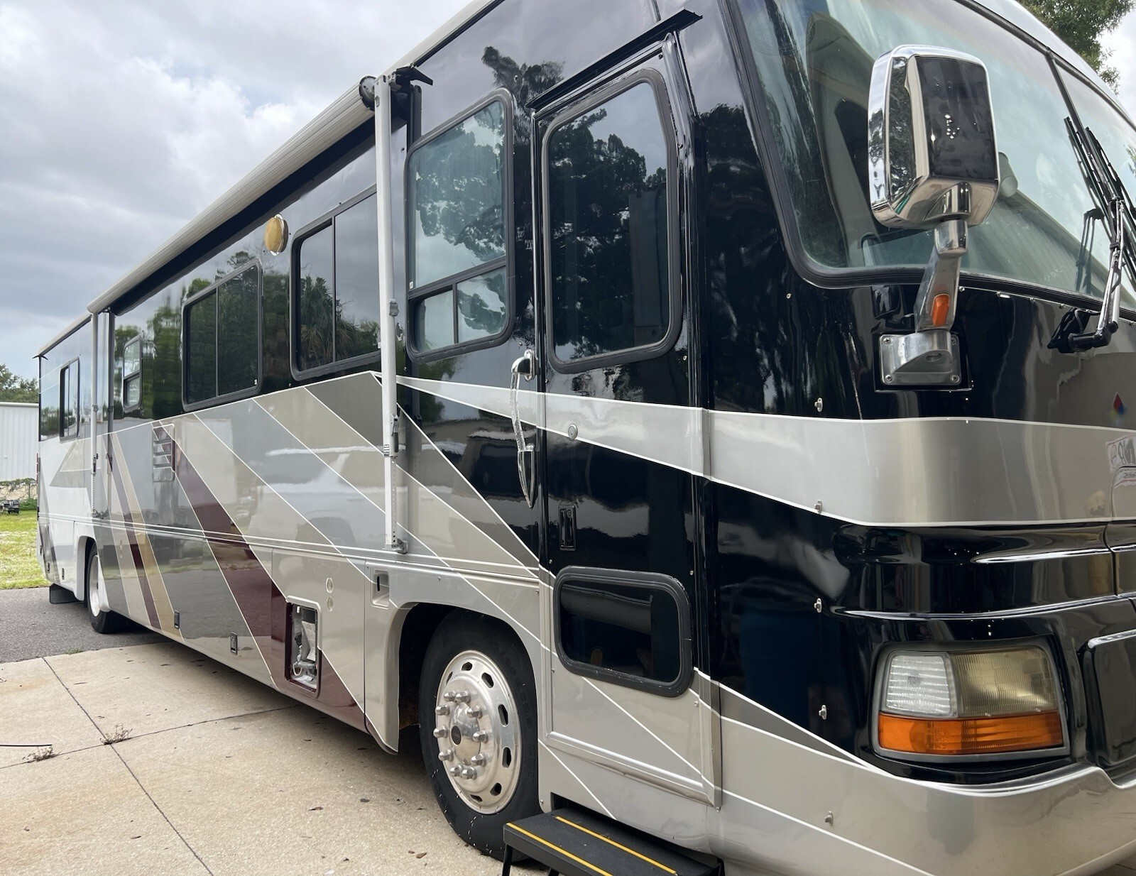 The 2001 Tiffin Allegro 40 OP is a 40-foot diesel motorhome built on a PowerGlide XC Raised Rail chassis, featuring a 330 HP Cummins engine and 2 slide-outs. Key specifications include an integrated air leveling system, front and rear air suspension with custom-tuned Koni shocks, front disc brakes, and a three-stage compression brake. It is a Class A, self-contained motorhome. Allison 3000MH six-speed automatic with lock-up torque converter. 7.kw Onan Diesel Generator. Need new awning. Contact with questions