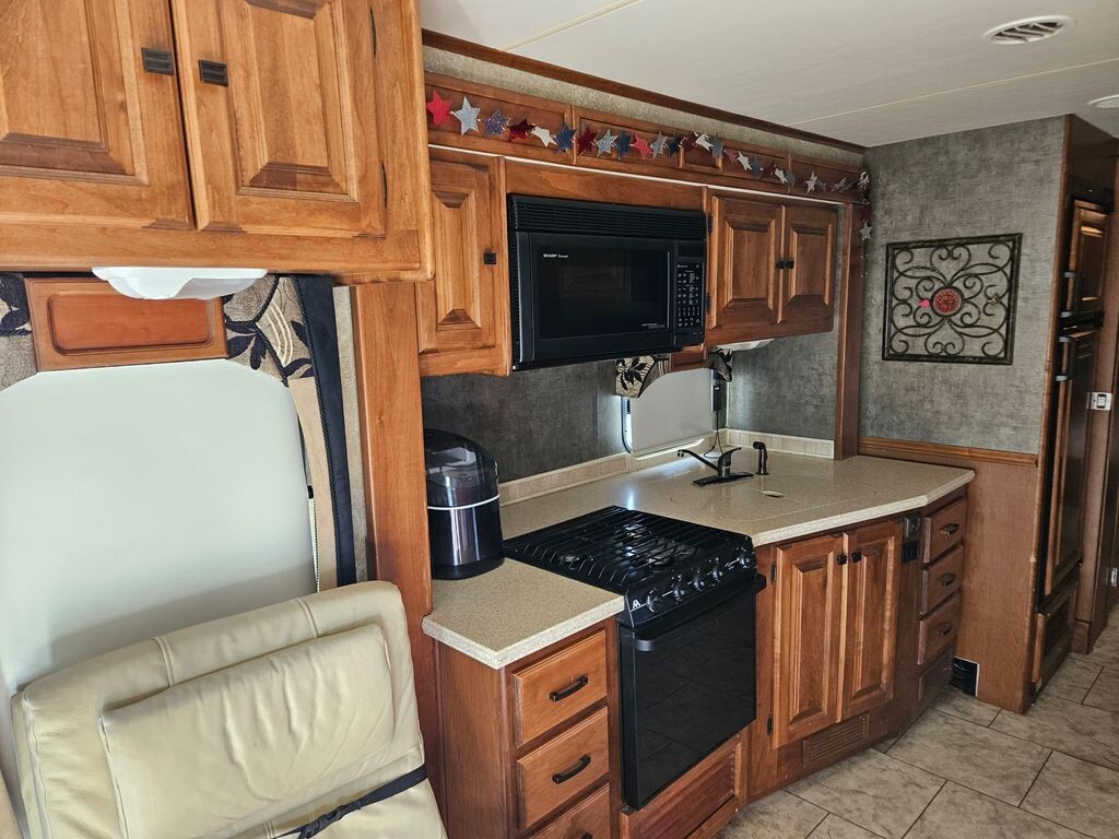Step inside to a beautifully appointed living space designed with comfort and functionality in mind. The kitchen is equipped with a convection microwave oven, ice maker, and generous storage, making meal preparation effortless whether youre entertaining or enjoying a quiet night in. Relax in the living area with two TVs, a CD/stereo system, and cable-ready connections for campground convenience. A built-in central vacuum system adds a touch of residential luxury rarely found in this class.