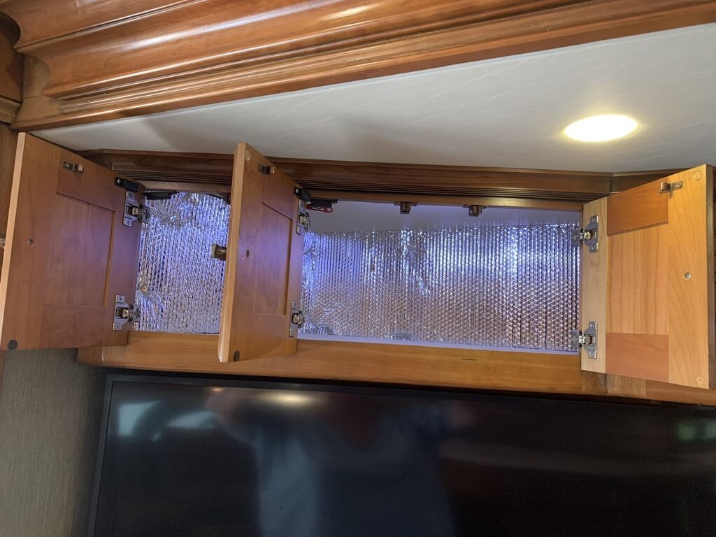 The spacious rear master suite features a king-size bed, creating a true retreat for restful nights on the road. Premium cabinetry throughout the coach has been professionally insulated, enhancing temperature control, reducing road noise, and elevating overall comfort in every season. This thoughtful upgrade sets this coach apart and contributes to a quieter, more energy-efficient living environment.