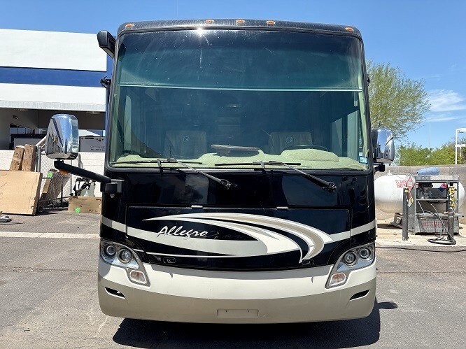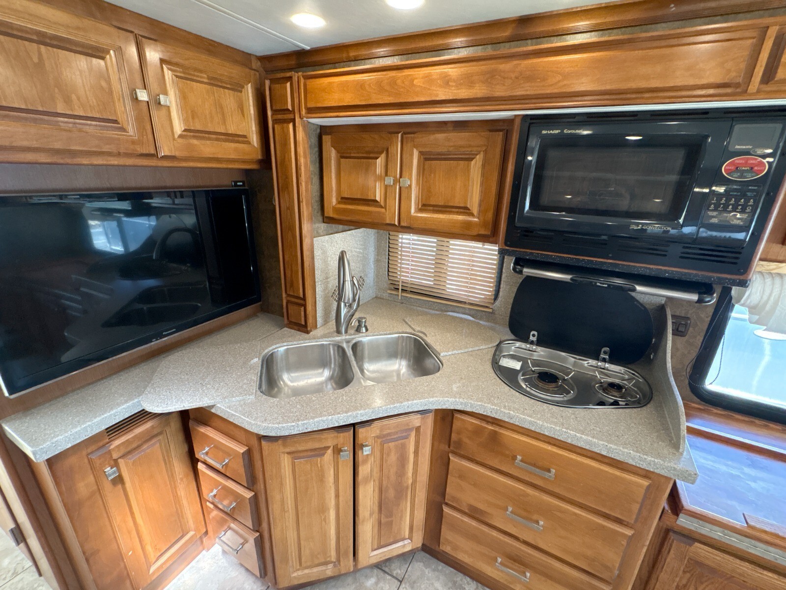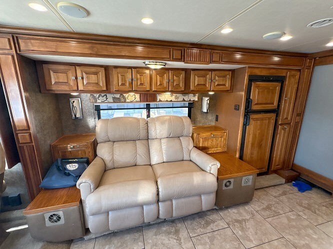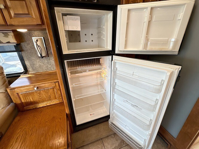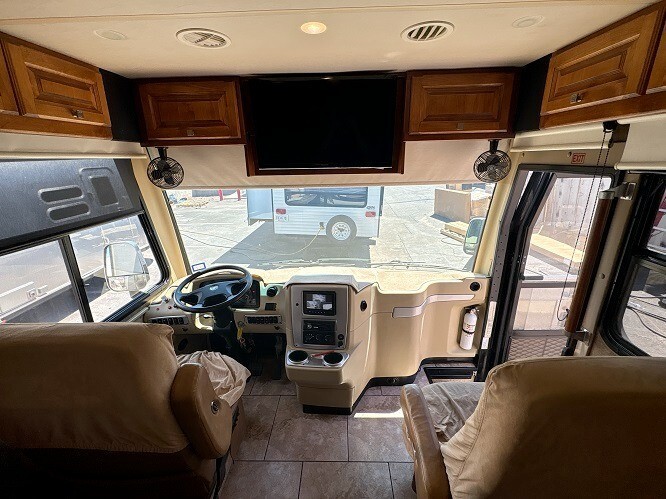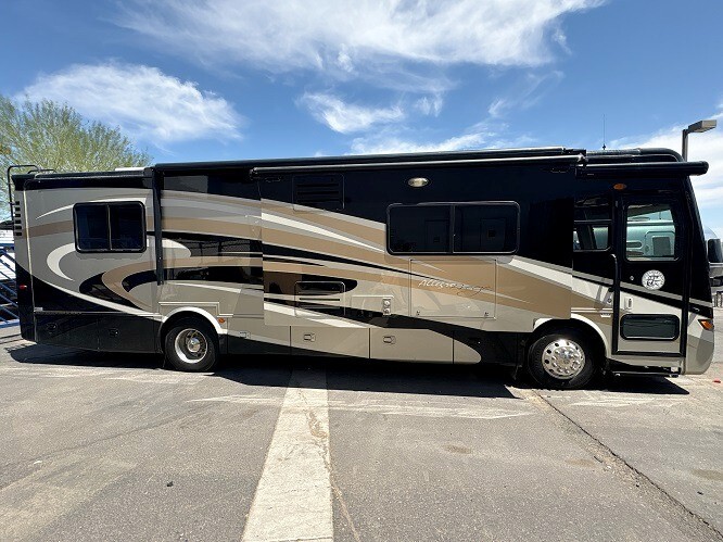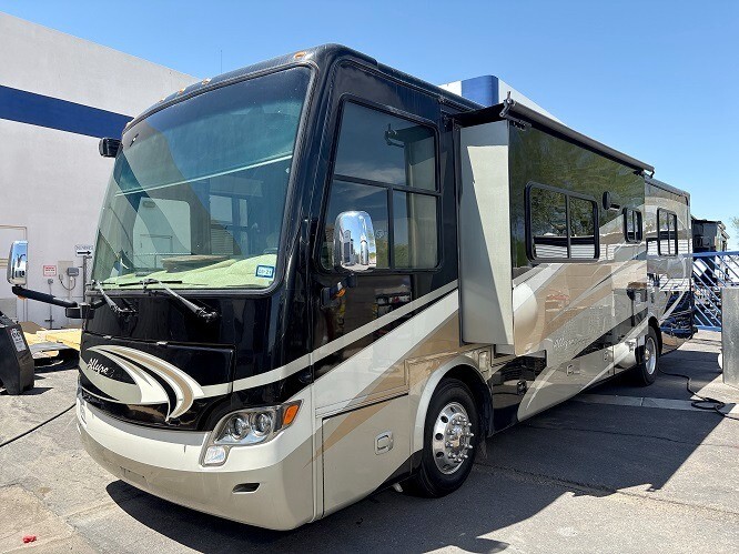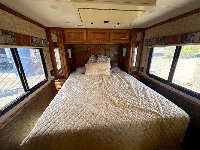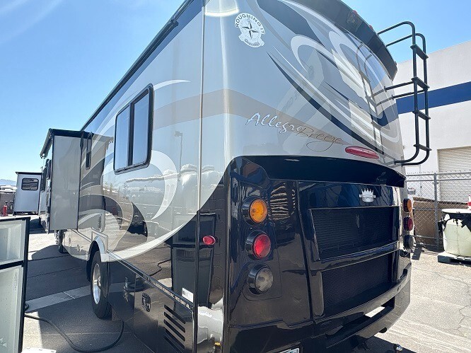 DescriptionSleeps 5 Slides 2Length 33 ft 2 in Ext Width 7 ft 11 inExt Height 11 ft 2 in Int Height 6 ft 6 inHitch Weight 4500 lbs GVWR 23500 lbsFresh Water Capacity 70 gals Grey Water Capacity 50 galsBlack Water Capacity 30 gals Tire Size 265/70R 19.5Miles 55326 Engine Navistar MaxxForce 7Chassis Powerglide