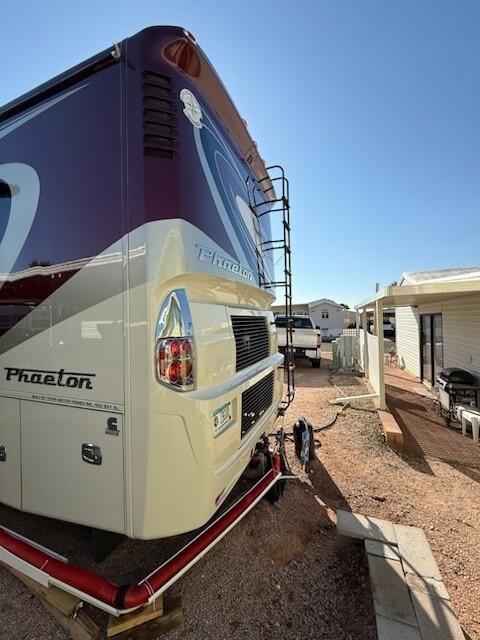 The unit features multiple slide-out storage trays in the basement storage area, power take-up reels for the 50-amp power cord and the water hose, and all of the RV systems are clearly marked and easily accessible around the unit. On the roof, there is both a HD satellite dish as well as an in motion satellite. I also have a T-Mobile modem for your internet and WiFi.