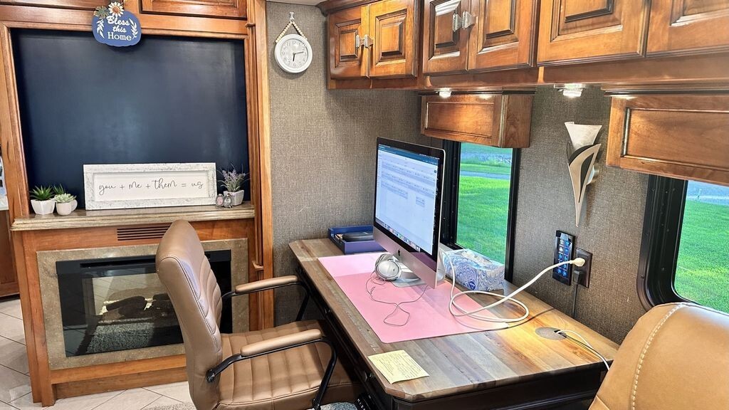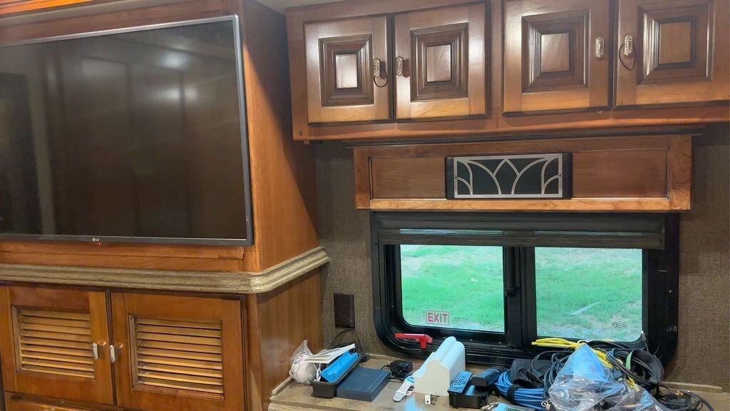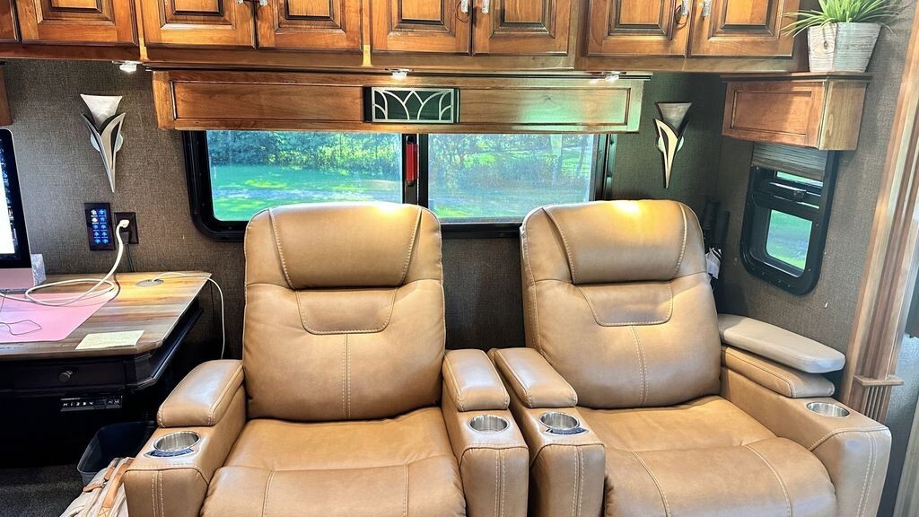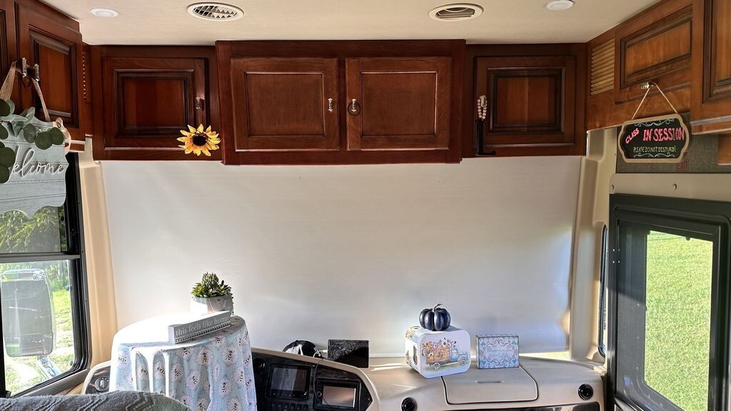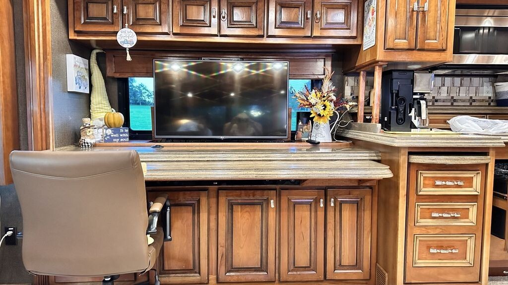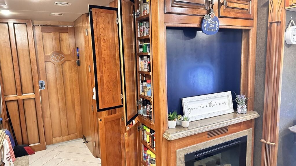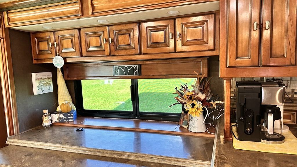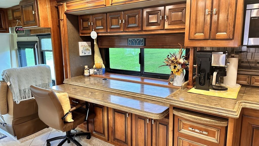 Customized throughout with solid wood valances, tons of extra storage front to back, and a customer bar area