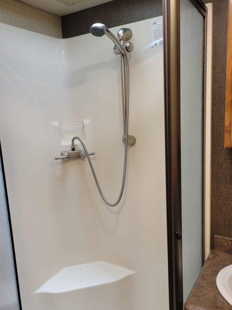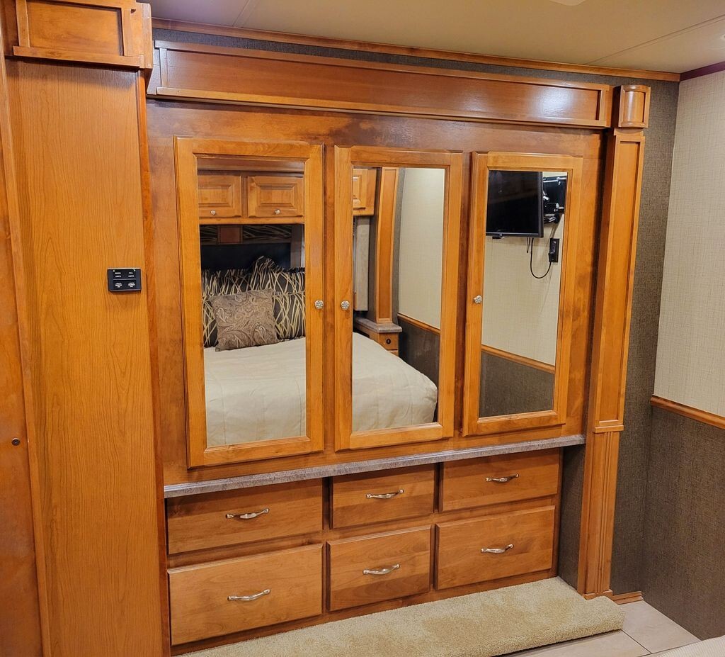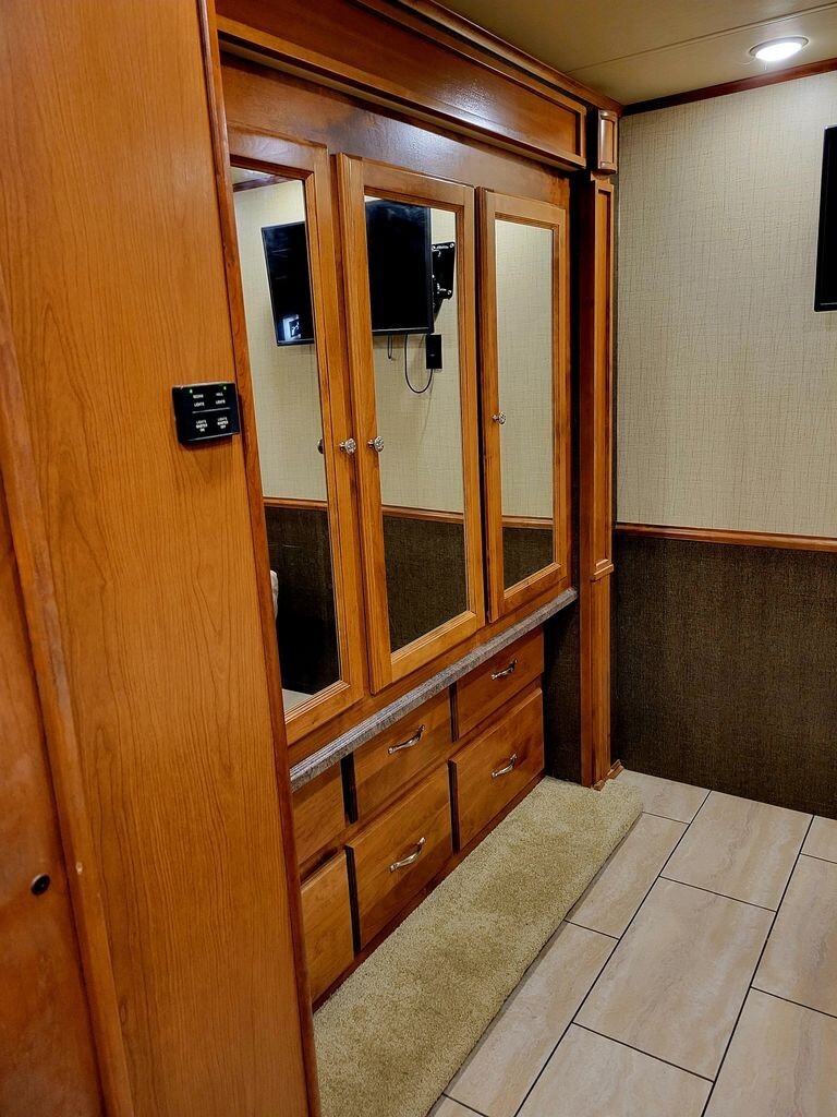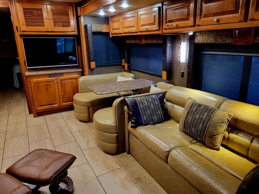 Inside, the space really shines. With four slide-outs (all with toppers), the coach opens up beautifully, and the freshly reupholstered captains chairsalong with new fabric for the remaining furnituregive the interior a clean, updated feel. The kitchen is pure Tiffin: Corian countertops, stovetop, oven, convection microwave, and a refrigerator/freezer that runs on electric or propane, plus a central vacuum because yes, luxury should also be practical. Climate control is covered with cab A/C, a front A/C with heat pump, and a second rear A/C, while the power awning with sun screen keeps outdoor lounging comfortable.
