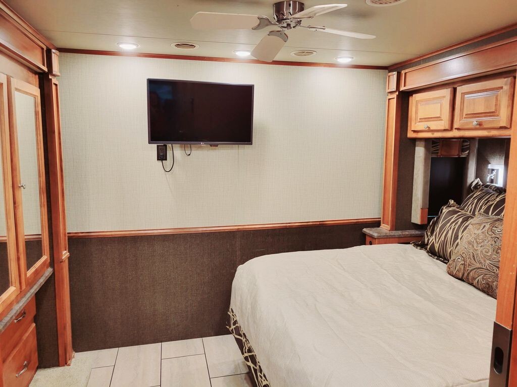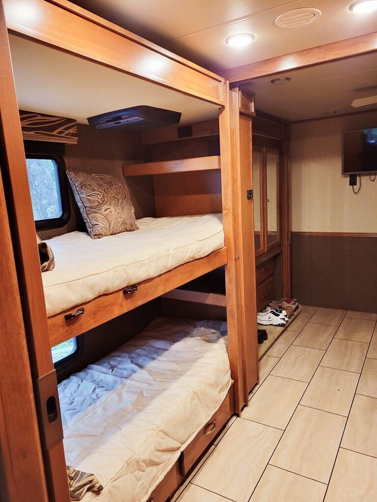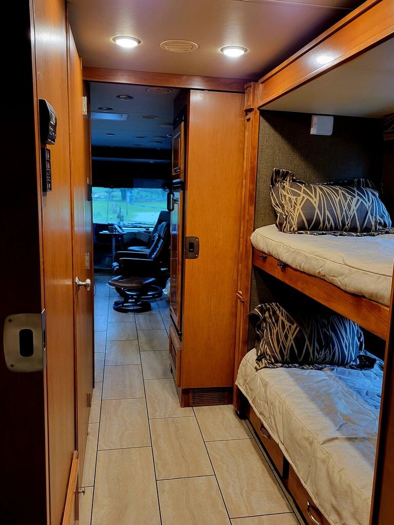 The 35QBA bunkhouse layout is a fan favorite for a reasonit sleeps everyone without turning bedtime into musical chairs. You get a queen walk-around bed up front (with a $500 mattress allowance from the seller), bunk beds, a sofa bed, dinette bed, and swivel captains chairs with a pedestal table that turn the cockpit into bonus living space. Entertainment is everywhere you want it: TVs in the living room, bedroom, over the bunks, and outside, plus backup and side cameras to keep things stress-free behind the wheel. Add in the Onan 7kW generator, full-body paint, receiver hitch, and TireMinder tire monitoring system, and youve got a coach thats equal parts polished, practical, and ready to roam.