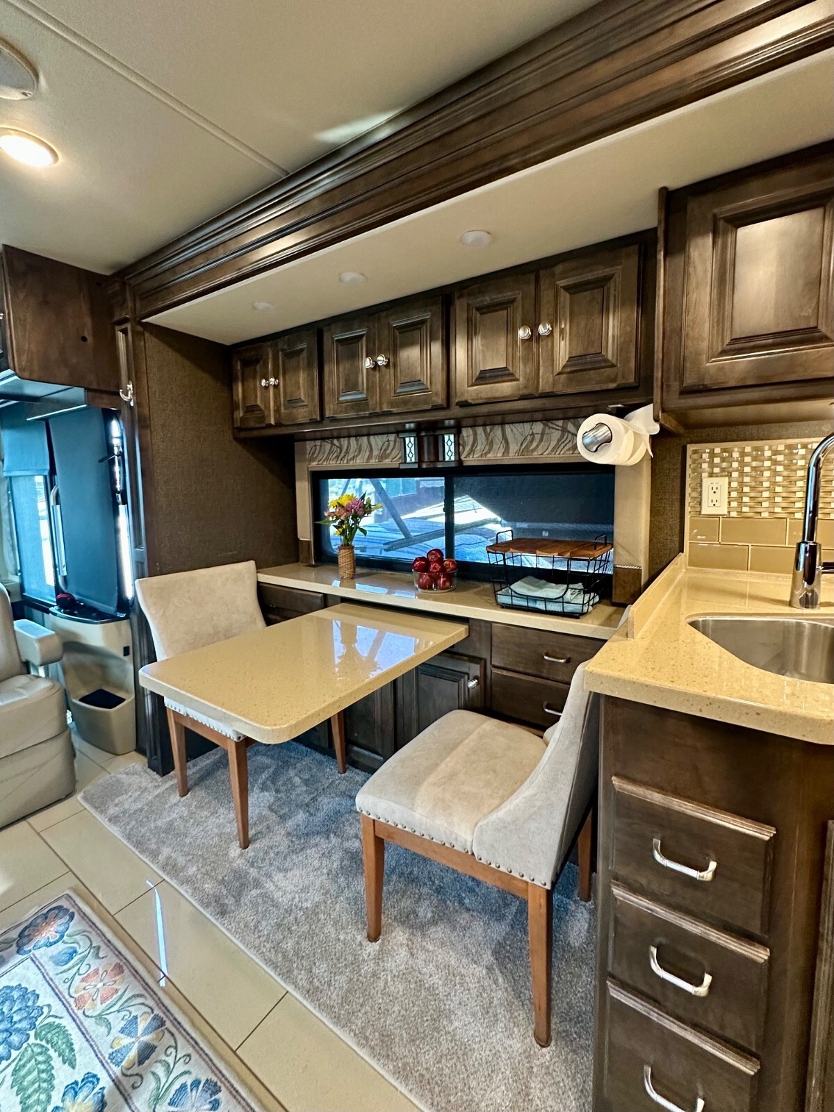 The dining area features the hard to find two chair table dinette with the computer workstation upgrade.