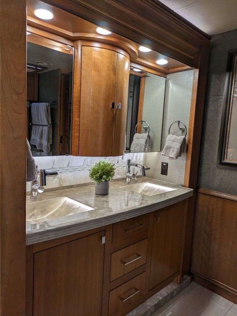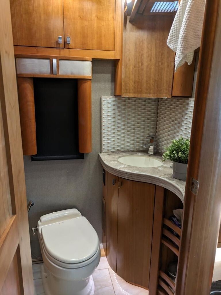 The 45OZ modelincludes a TV in the living area, a macerating toilet, and a large, renovated,, or updated interior designed for long-term, high-end travel.