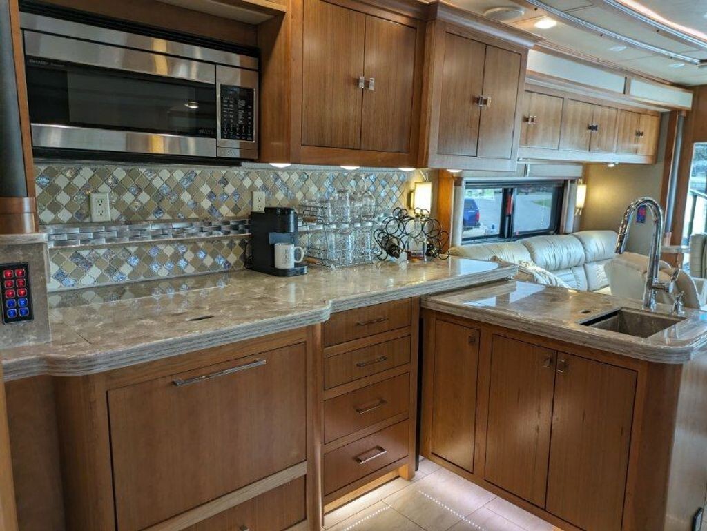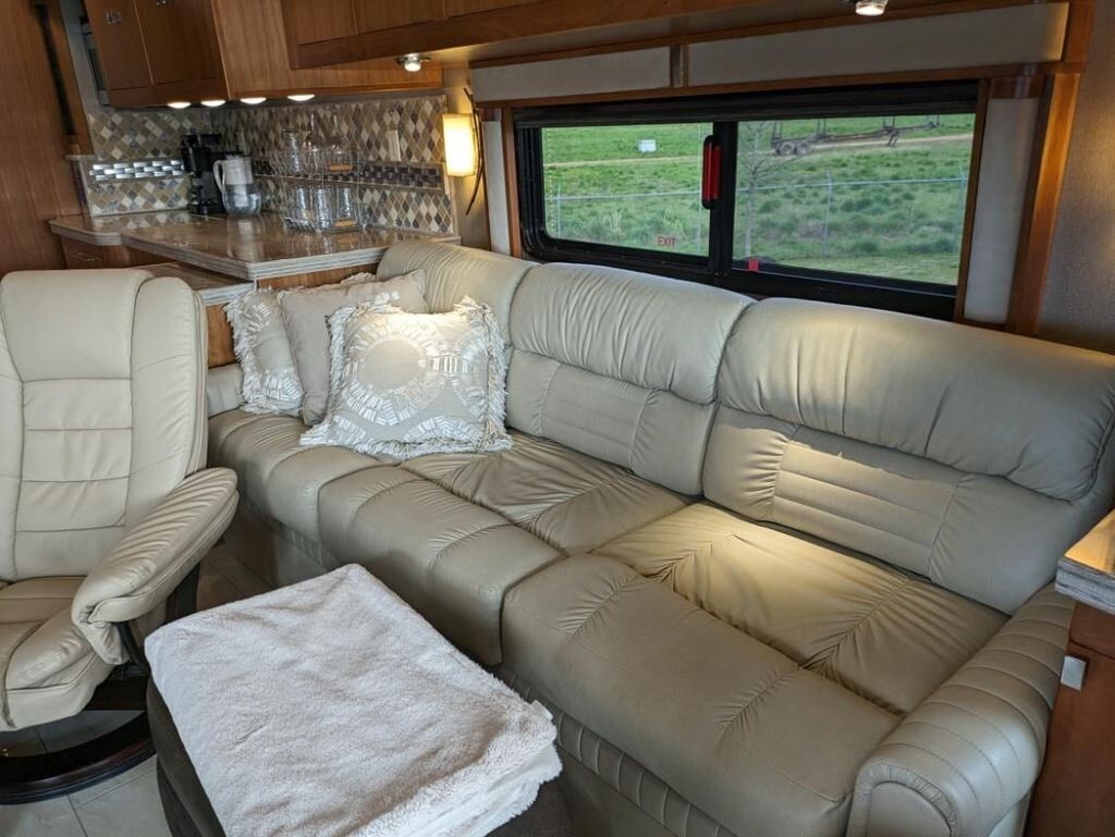 Luxury & Amenities: Features include a central vacuum system, three A/C units with heat pumps, multiplex lighting, 3 awnings, exterior entertainment center, and automatic air/hydraulic leveling.