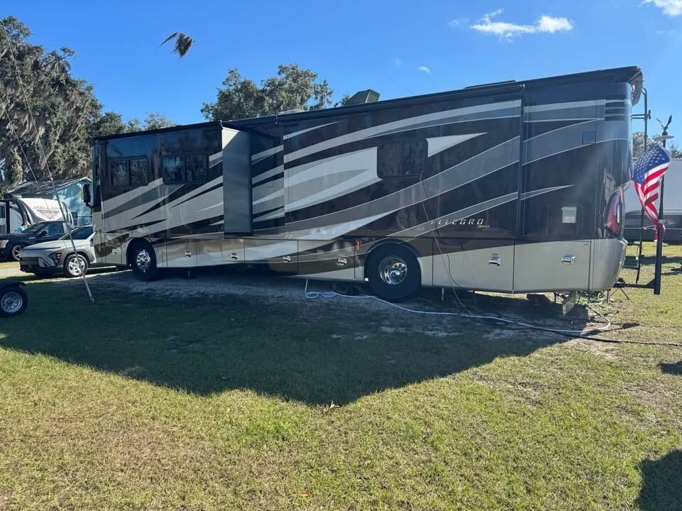 This Tiffin Allegro Red is powered by a Cummins 6.7L engine and an Allison automatic transmission with 27,200 miles. The overall length is 39.17 feet and it comes equipped with 4 power retractable slide-outs, 1 power retractable awning, 2 A/C units, a Cummins Onan generator, and plenty of room to sleep 6. This unit has been well-maintained.