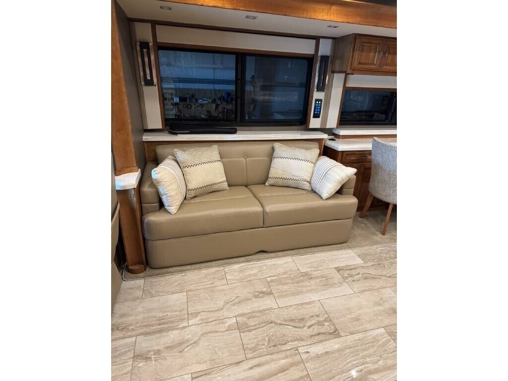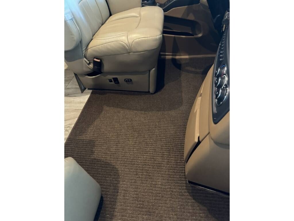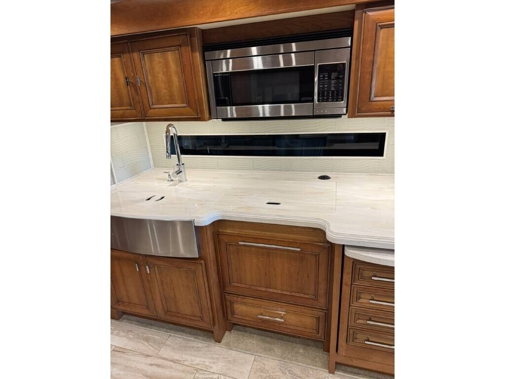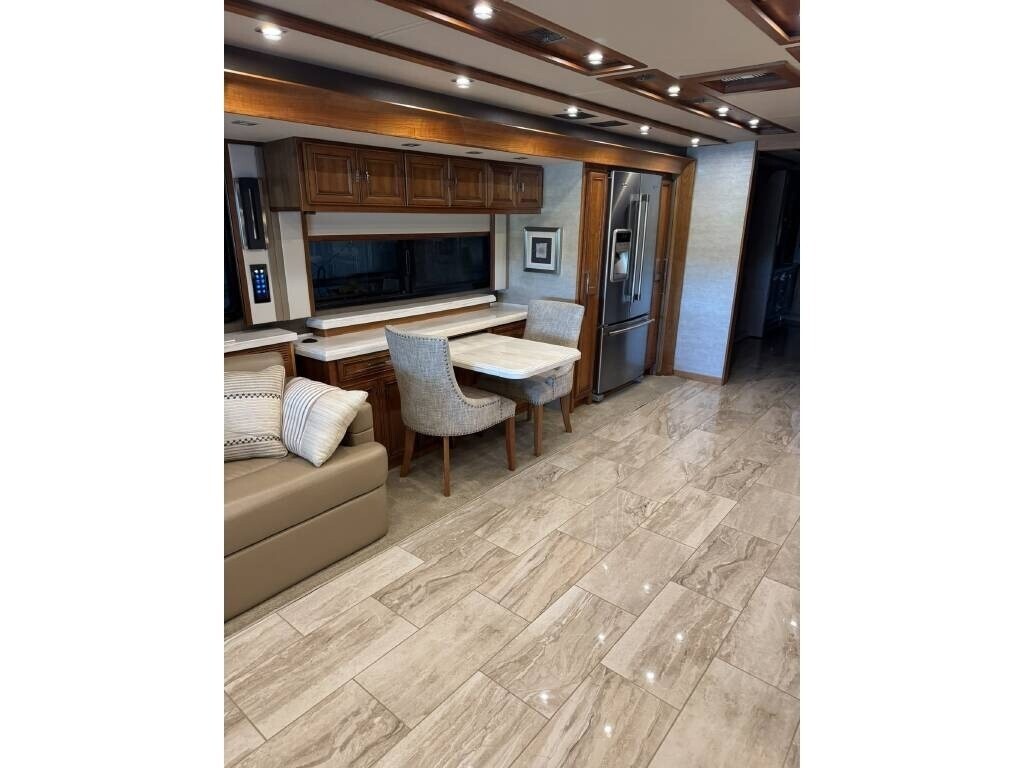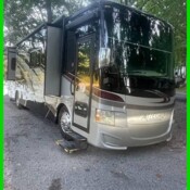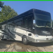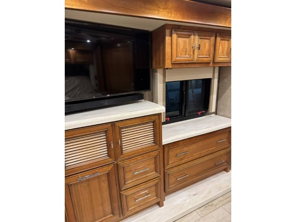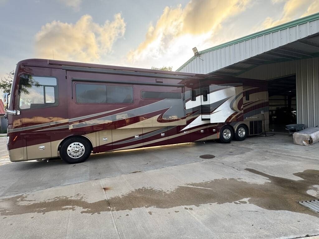 This 2019 Tiffin Motorcoach Allegro Bus 45OPP is in like-new condition with only 7,088 miles. Finished in Crimson full body paint with Glazed Honey Natural Cherry cabinetry, this luxury Class A features four slide-outs, heated tile floors, stacked washer/dryer, solid-surface finishes, and a power king bed. Entertainment includes JBL sound, three flat-screen TVs (TV over the windshield was removed and replaced with cabinets), DVD, Winegard satellite, and more. The kitchen area has been enhanced with a custom spice cabinet next to the sink. a Cummins 450 HP engine on a Powerglide chassis with a 12,500 KW Onan diesel generator. Additional features include snap-on wheel covers, mirror covers, and wiper covers. Sale also includes a 2014 Jeep Rubicon 2-door hardtop with 50,950 miles, fully set up for towing.