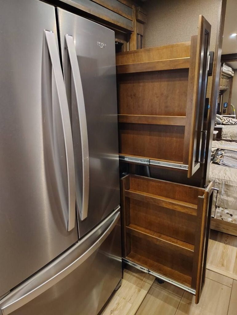 Step inside to a spacious, well-appointed interior where comfort meets style. The expansive living area features plush seating, a large dinette, and panoramic windows that flood the space with natural light - perfect for entertaining or relaxing after a day of adventure. The fully equipped kitchen boasts high-quality appliances, abundant counter space, and generous storage. You will find a residential refrigerator with an ice maker, and a two burner induction stove making, meal prep effortless anywhere your travels take you.