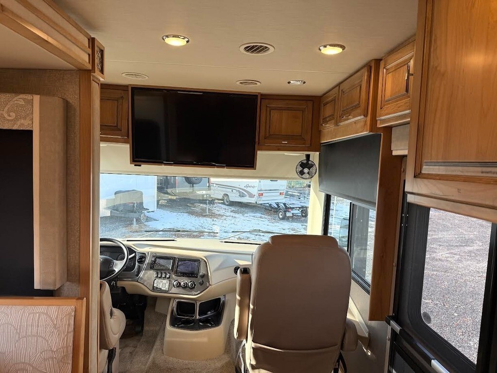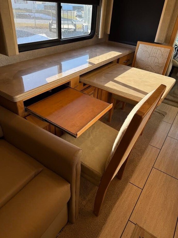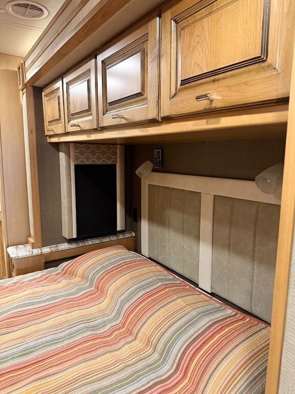 This Tiffin is powered by a 6.8L V10 engine and a 6-speed automatic transmission with 35,072 miles. The overall length is 37.5 feet, and it comes equipped with 2 power-retractable slide-outs, 1 power awning, 2 A/C units, an Onan generator, 1½ baths, a washer & dryer, an outdoor entertainment system, and plenty of room to sleep 4. This unit has been well-maintained.