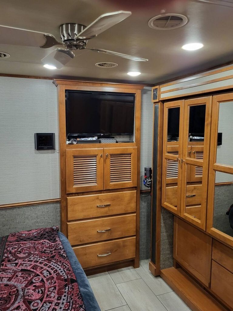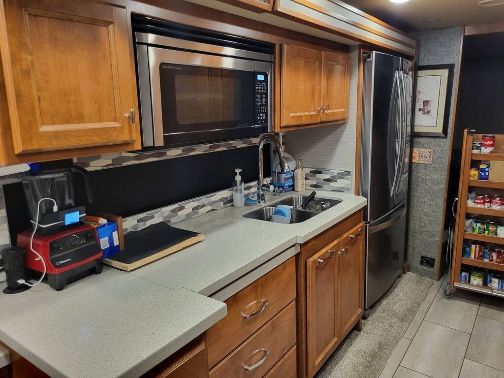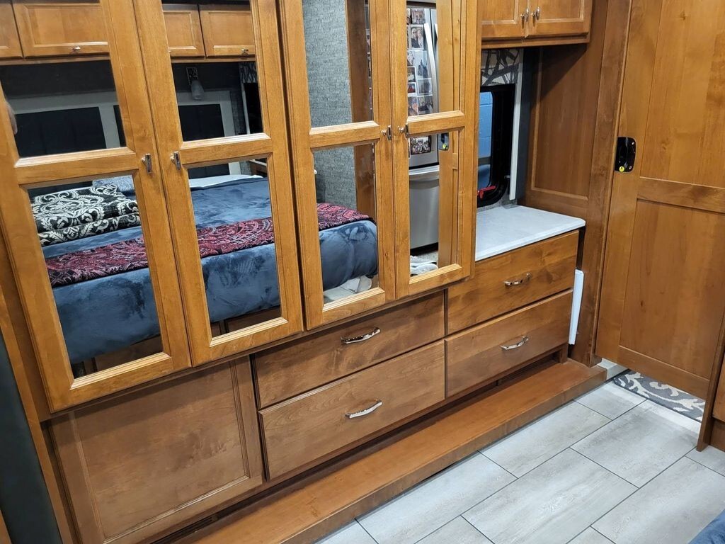 Inside, Tiffins renowned handcrafted cabinetry and luxury décor set a warm, upscale tone. Solid surface countertops flow throughout, offering durability and elegance in both the kitchen and bath.