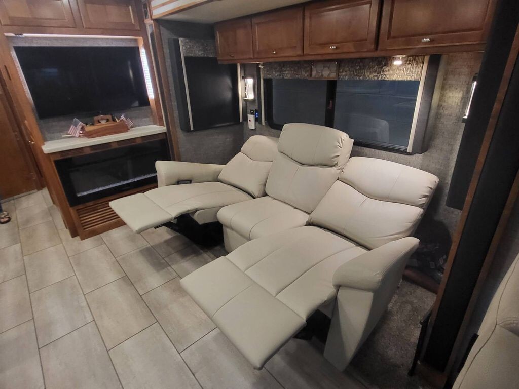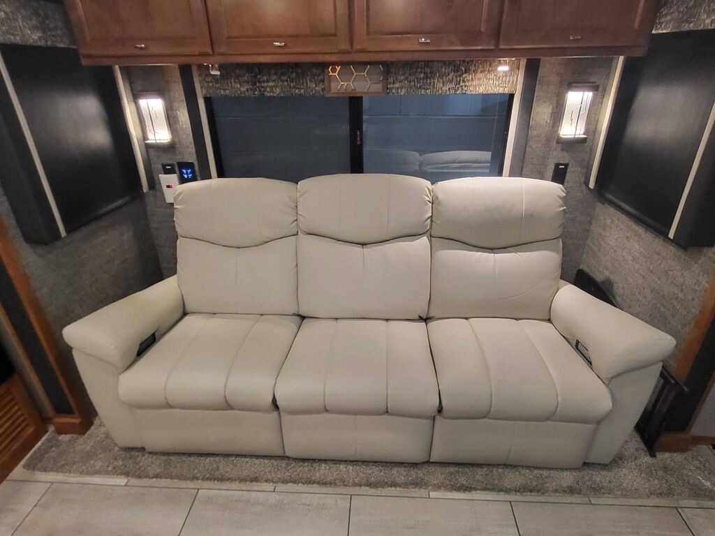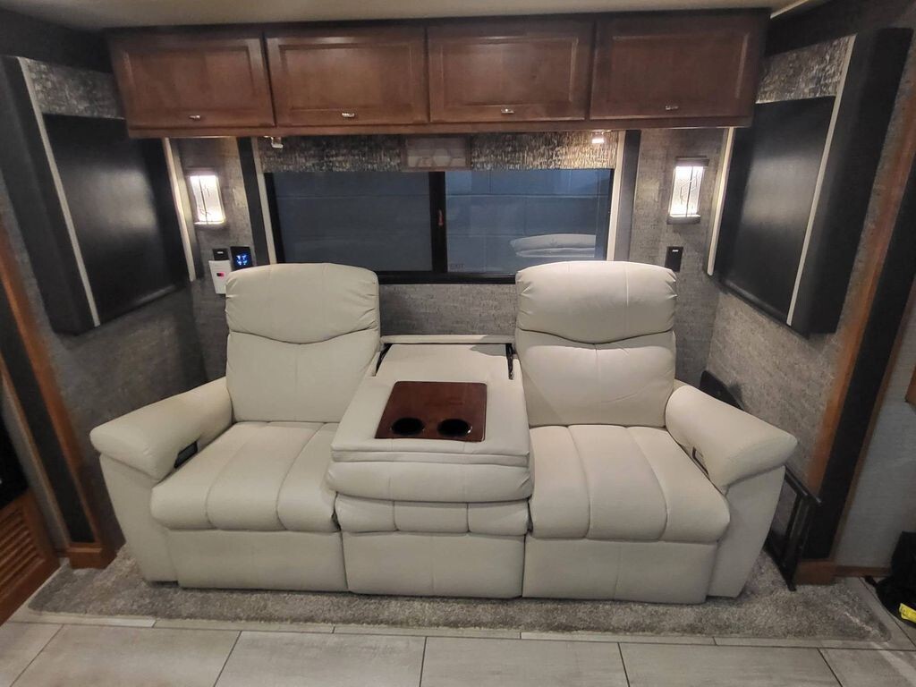 The living area has been tastefully upgraded with theater seating in place of the sofa, perfectly positioned for the home theater system-ideal for movie nights after a day on the road.