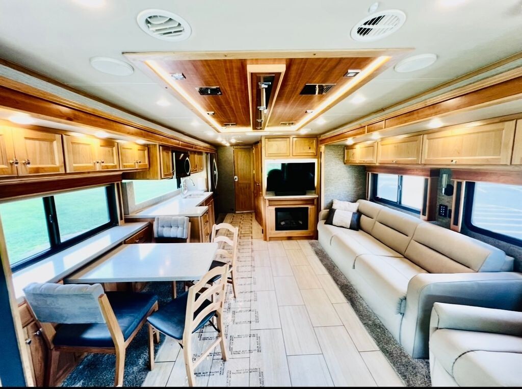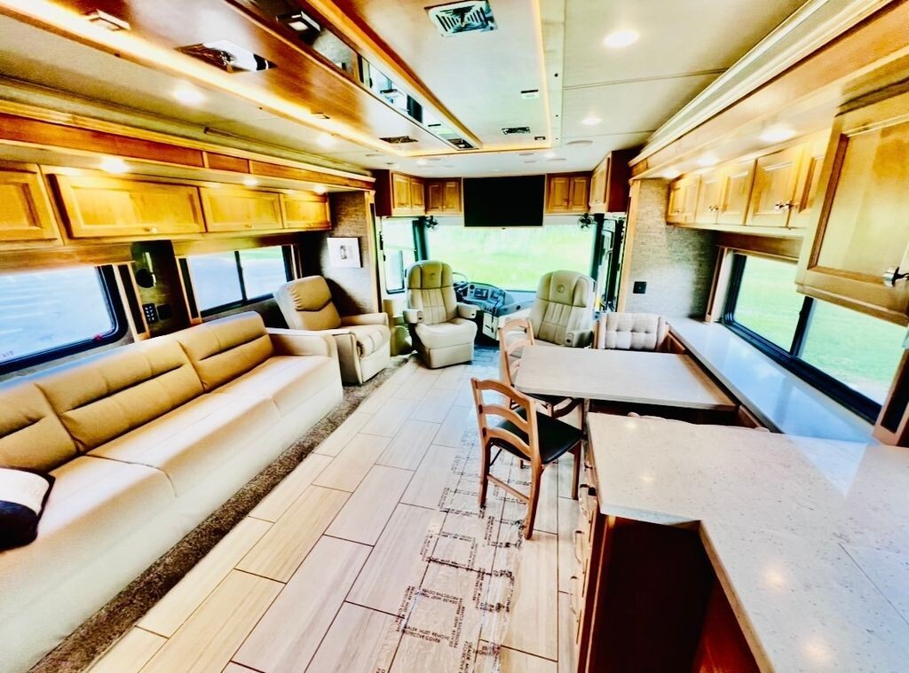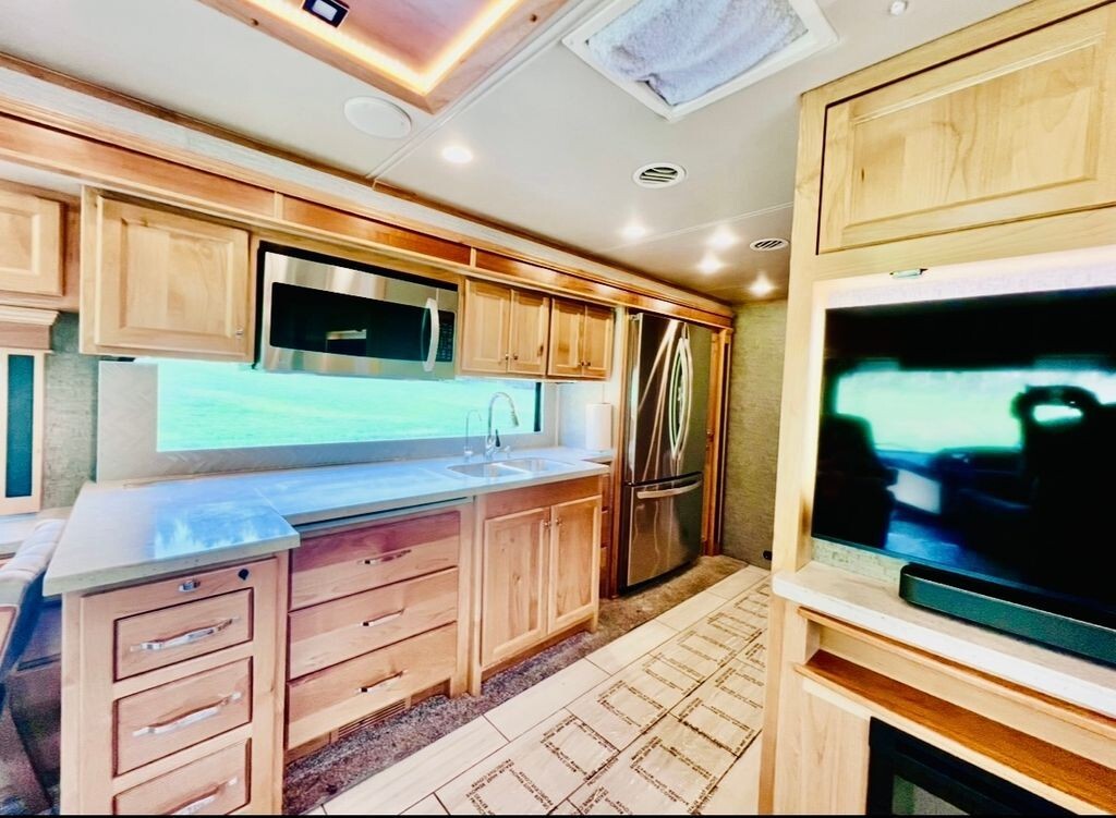 Step inside to discover an inviting interior that feels like home. The spacious living area boasts plush seating, a large dinette, and panoramic windows that flood the space with natural light - ideal for relaxing, entertaining, or enjoying your favorite views. The fully equipped kitchen features premium appliances, generous counter space, and abundant storage, making meal preparation effortless whether youre on the road or at your favorite destination.