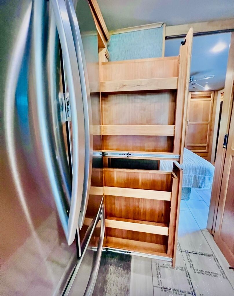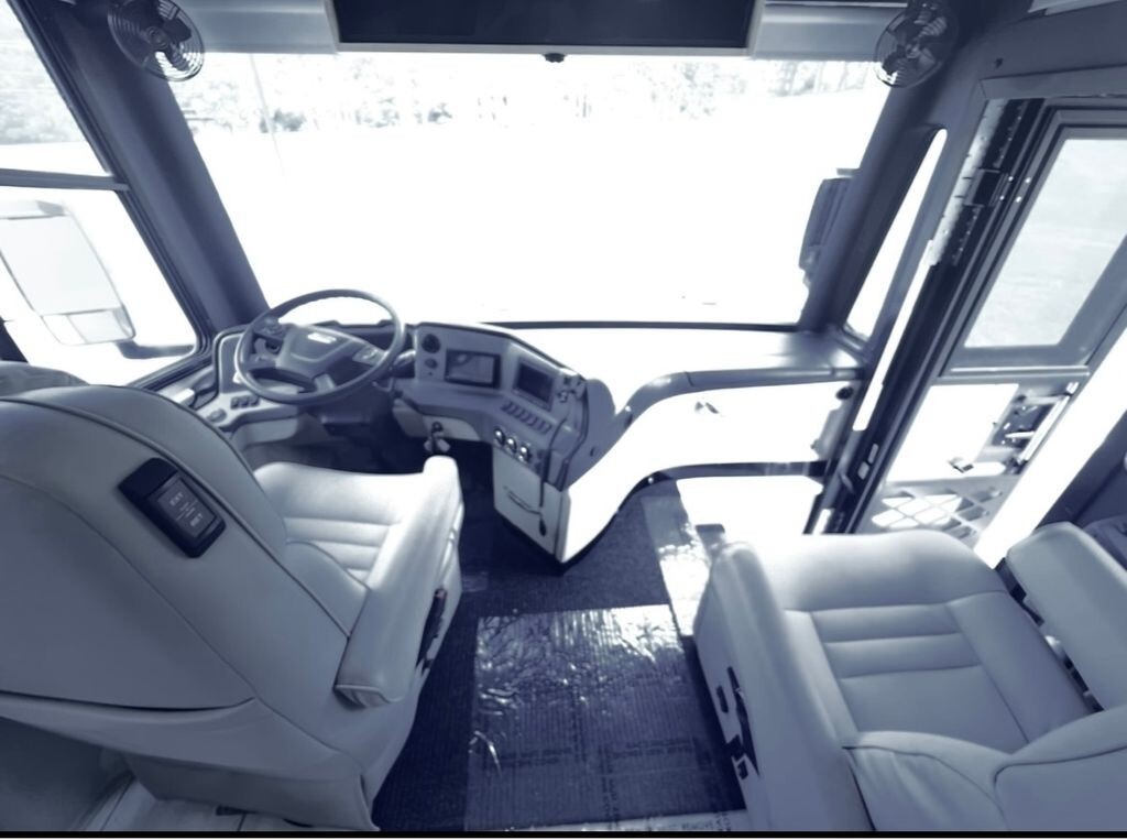 Retreat to the private master bedroom at the rear, complete with a comfortable king-size bed, ample wardrobe space, and elegant finishes that create a serene sleeping environment. The coach also includes a full restroom with quality fixtures and thoughtful touches throughout. Behind the headboard you will find a Egress panel, which will come in handy incase of an emergency. You are able to pop the panel out and a ladder will come out for you to exit the vehicle safely.