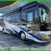 Pack your bags and load up into this motorhome for a luxurious adventure! The rear private bedroom has a king bed slide, a bank of drawers next to a TV, a large closet, and a wardrobe withwasher and dryer so you can have clean clothes throughout your entire trip. The full bathroom has a shower skylight, gravity flush toilet, solid surface countertop, and a handheld shower head with a slide bar for added convenience. When you're ready to eat, just whip up a meal on the three burner propane cooktop or use the convection microwave. You can dine at the dinette computer workstation with a lift TV! You can spend your evenings with a movie since there is a living area TV with afireplace, or you can head outdoor to enjoy the exterior TV and Girard power awning with LED lights!