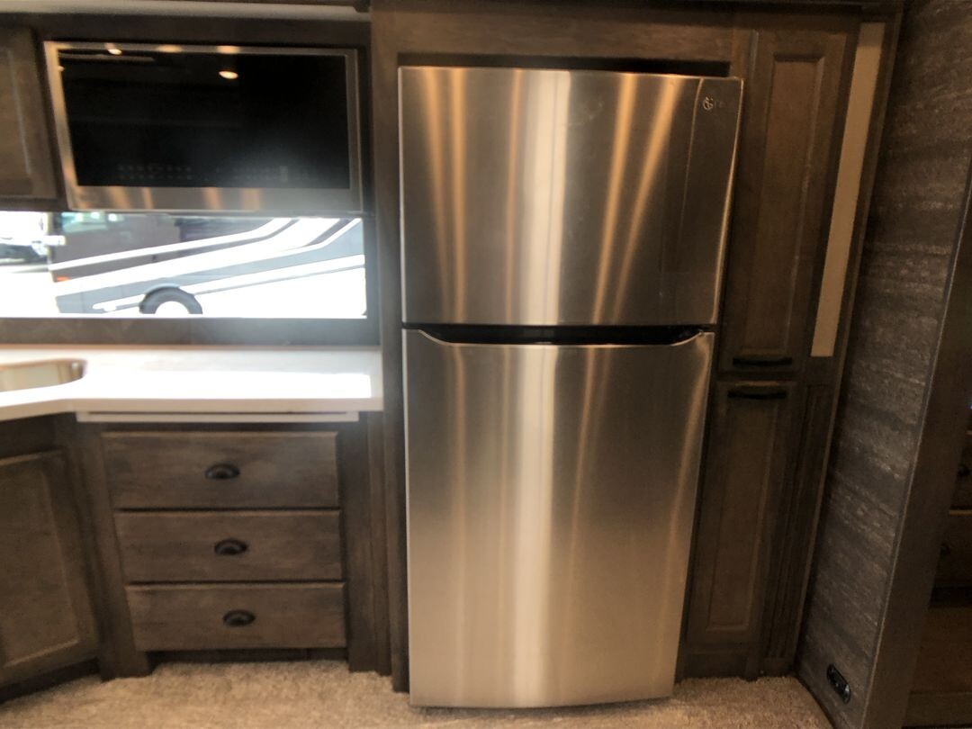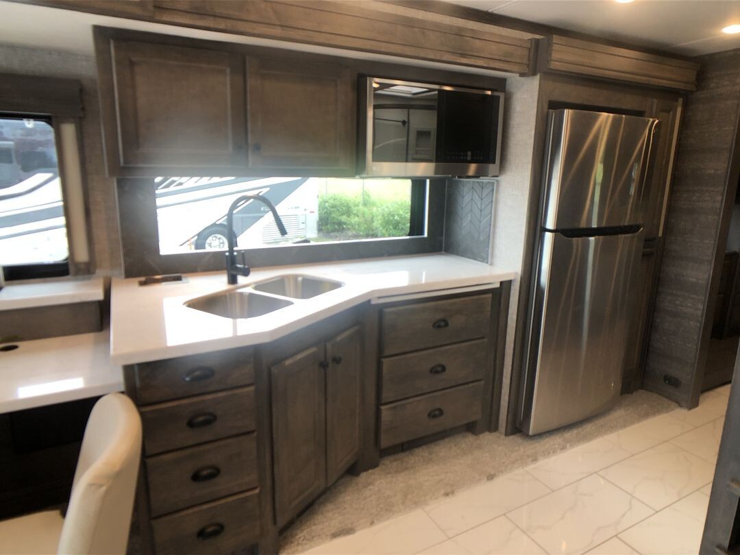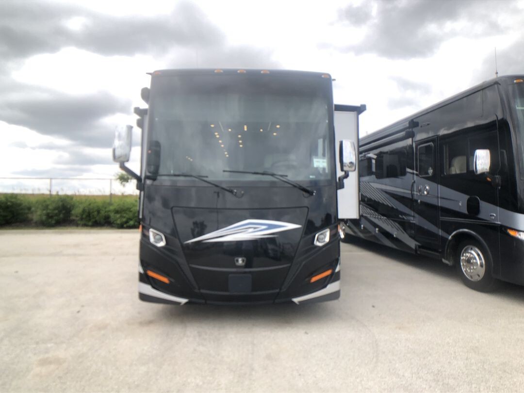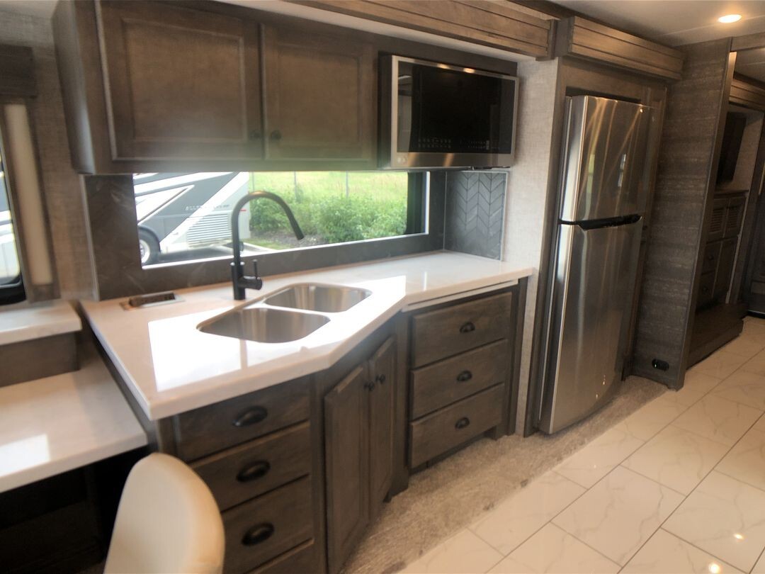 Measuring approximately 35 feet 2 inches in length, the 33AA balances spaciousness and maneuverability. Its exterior features modern graphics and a high-gloss finish that stands out on the road. The large power-retractable awning extends your living space outdoors, providing ample shade for relaxation. With four slide-outs, the interior becomes remarkably roomy, ensuring comfort without feeling confined.