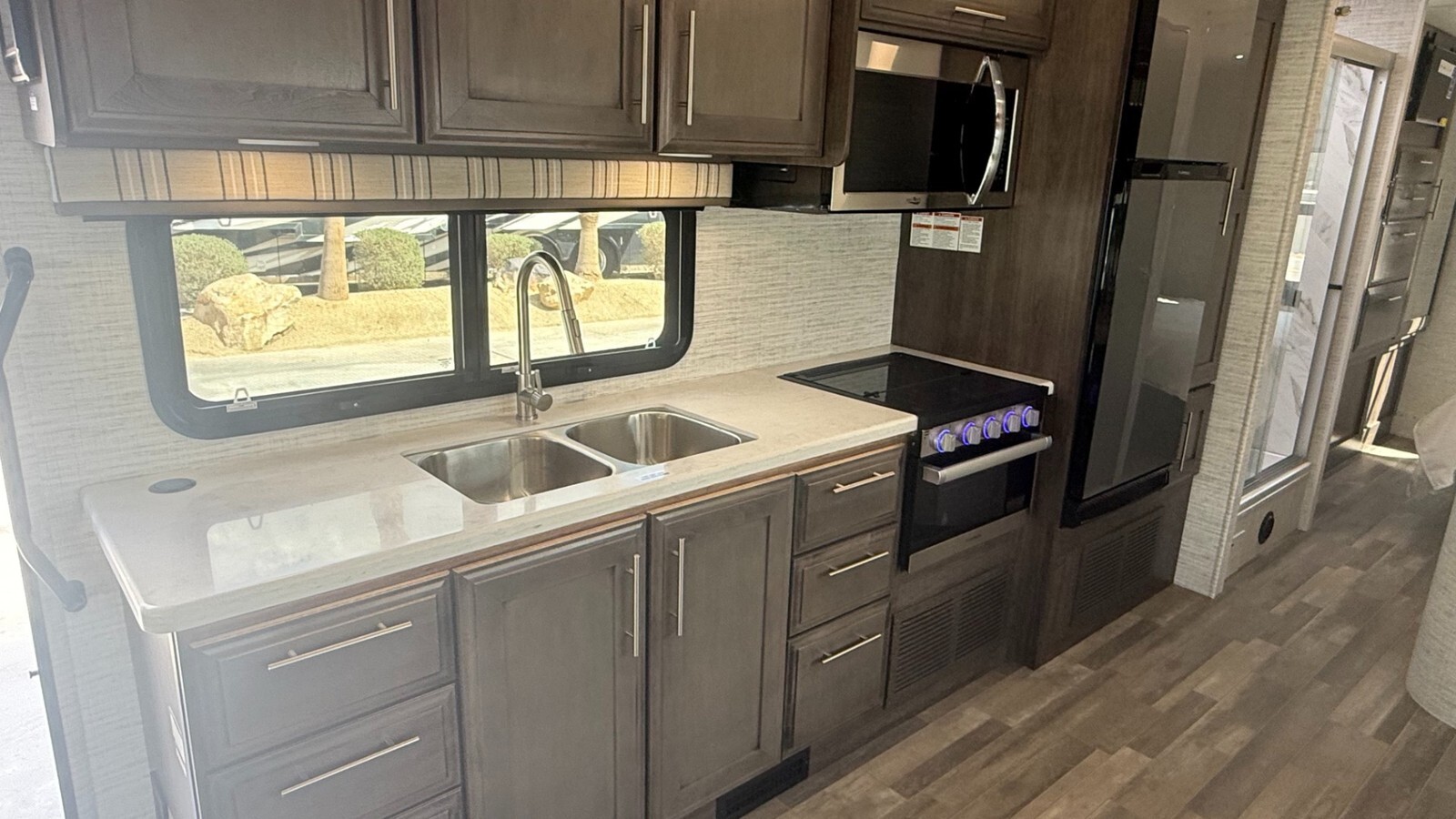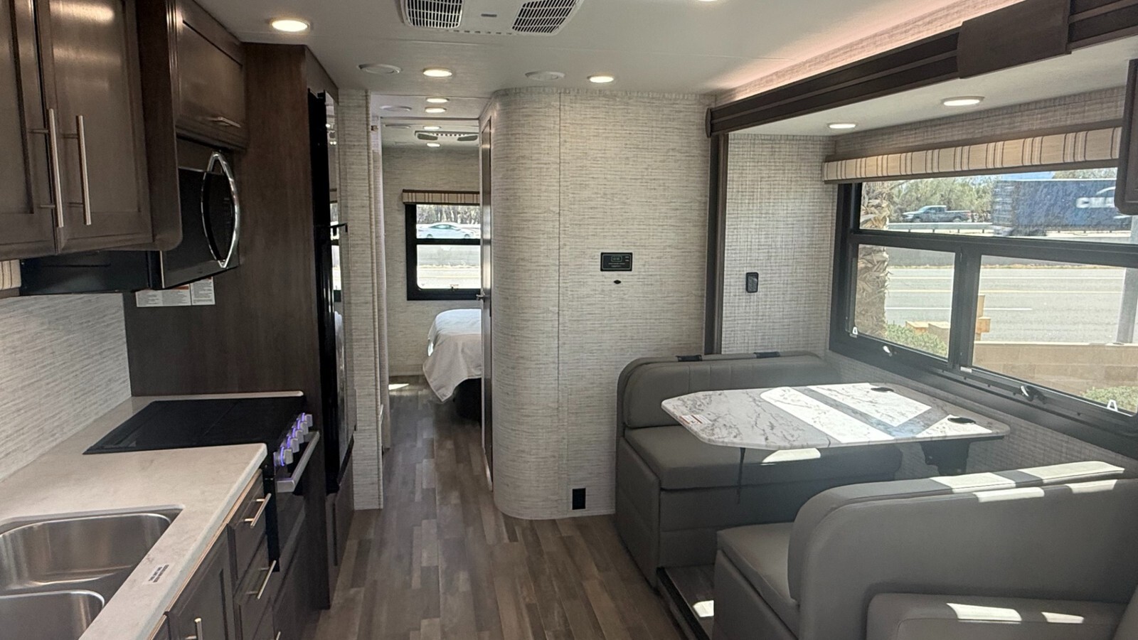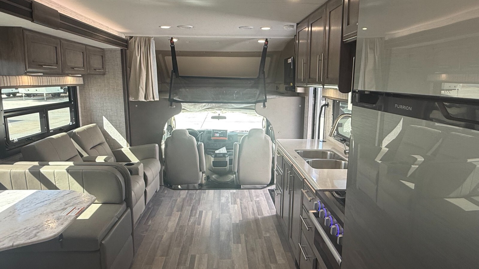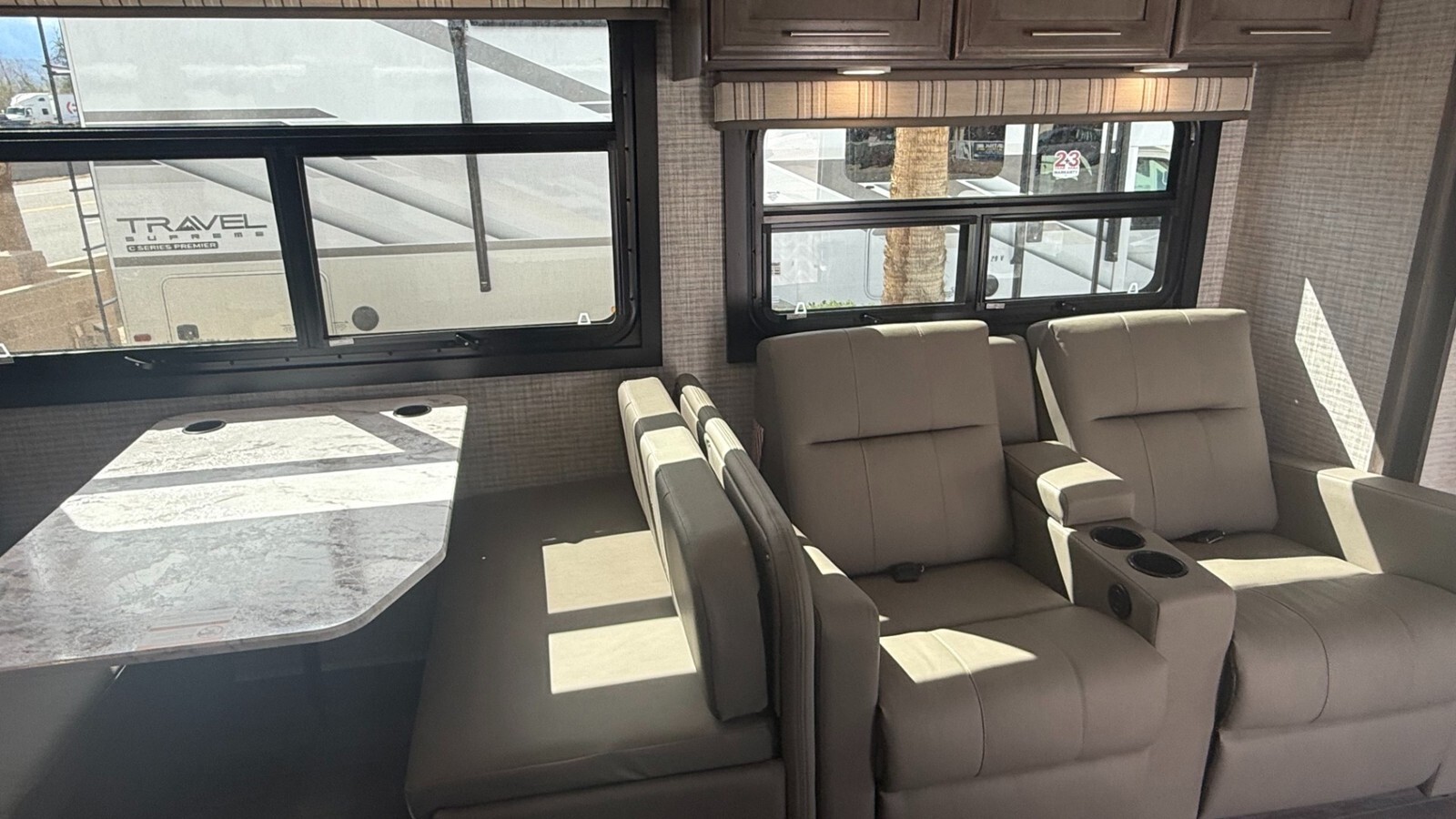 Experience the 2025 Travel Supreme 29V, a Class C motorhome designed for comfort and adventure. Built on a sturdy Ford E-450 chassis with a 7.3L V-8 engine, this RV offers a smooth and reliable ride. The 29V features a sleek, aerodynamic exterior with LED lighting and a large power awning, enhancing both style and functionality. Multiple storage compartments provide ample space for all your travel essentials.Inside, the spacious living area includes comfortable seating with durable upholstery, creating a cozy atmosphere for relaxation. Large windows allow plenty of natural light, with shades available for privacy and climate control. The fully equipped kitchen boasts a stainless steel refrigerator, a three-burner stove, and a compact microwave, along with ample counter space and storage for easy meal preparation. The dinette area is ideal for family meals or game nights and can convert into additional sleeping space if