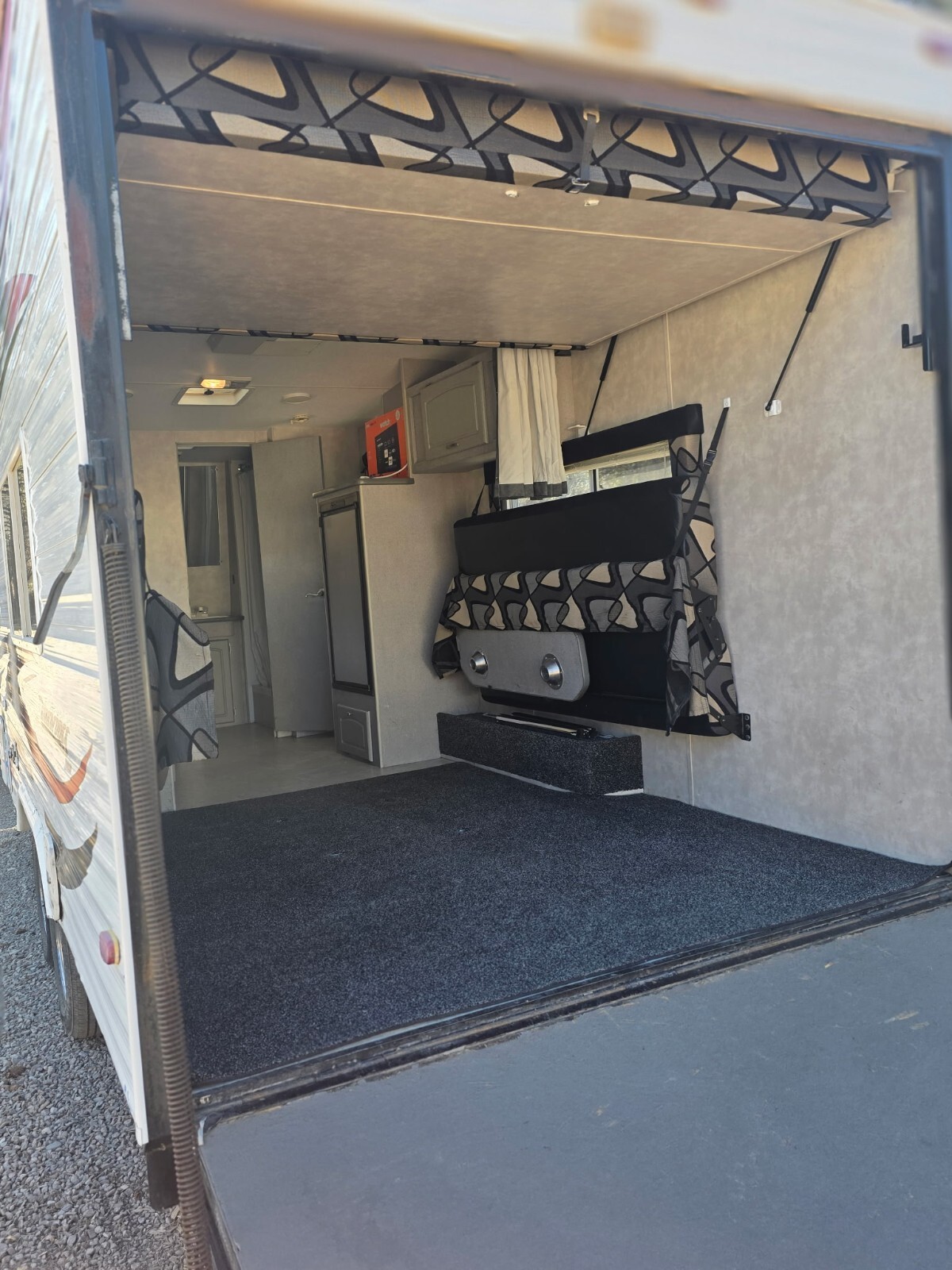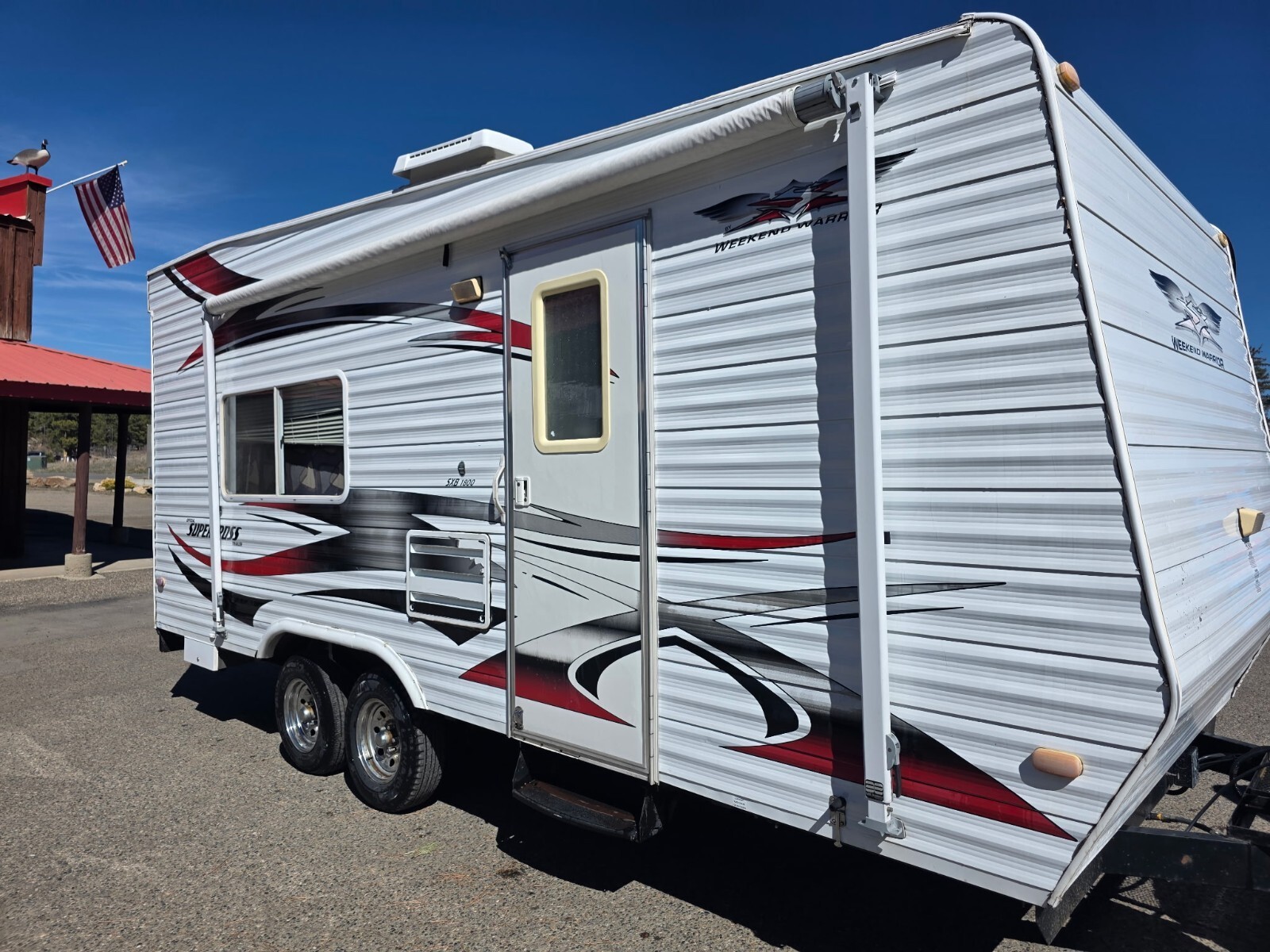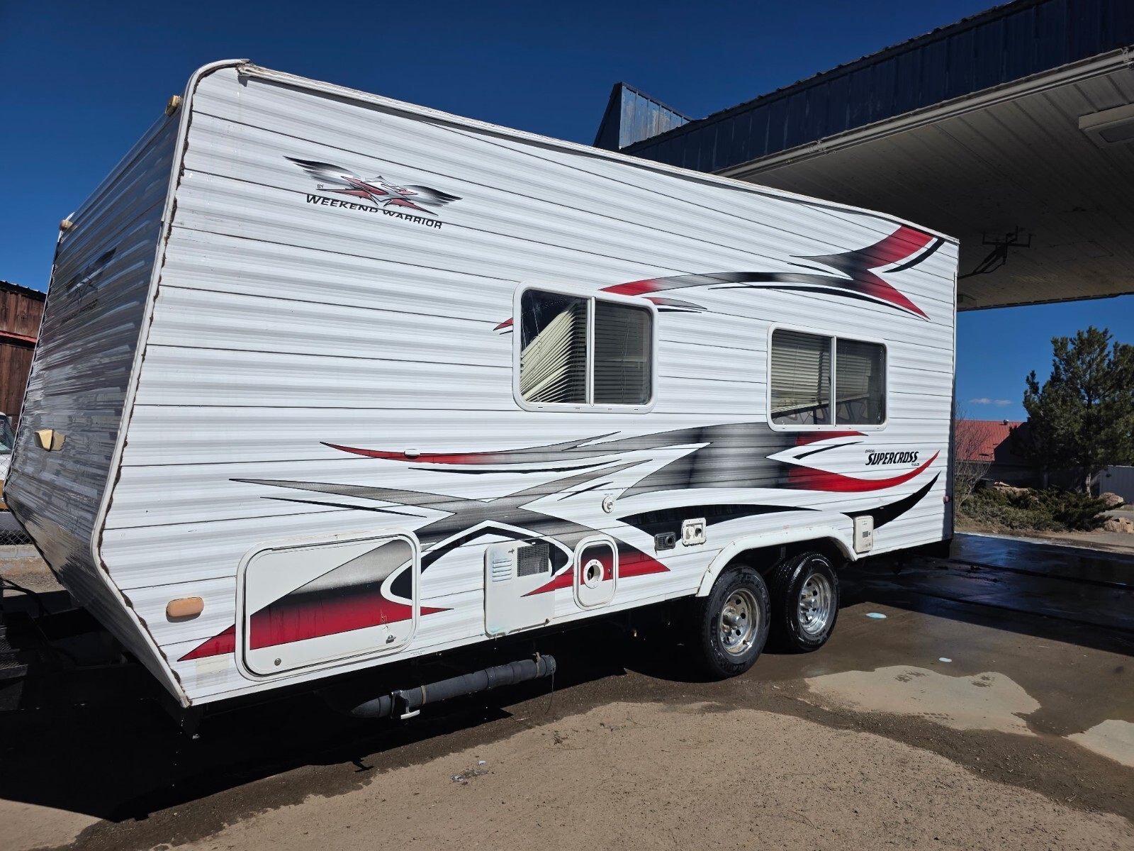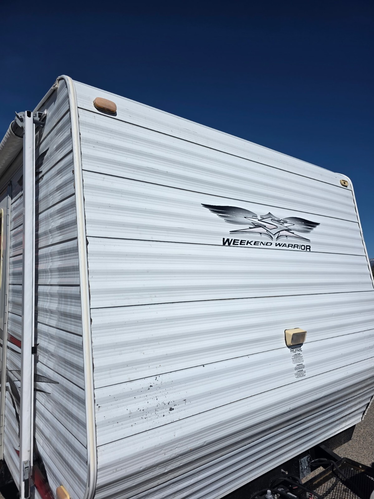 2009 Weekend Warrior SXB 1800. Is a 20 foot toy hauler travel trailer. Approx. 3,500 lbs dry wt. Designed for light duty toying. Features a large front bathroom, rear cargo ramp and sleeps up to 4 comfortably. It has a loft bed and twin beds. Key features include 30 gal fresh water tank, fuel station and sturdy construction. Tires have been upgraded to heavy duty load range D trailer tires.