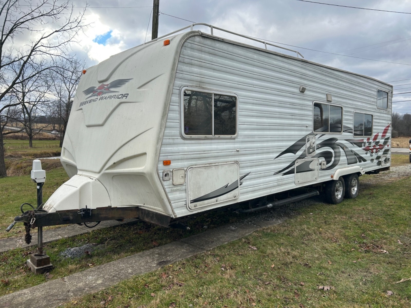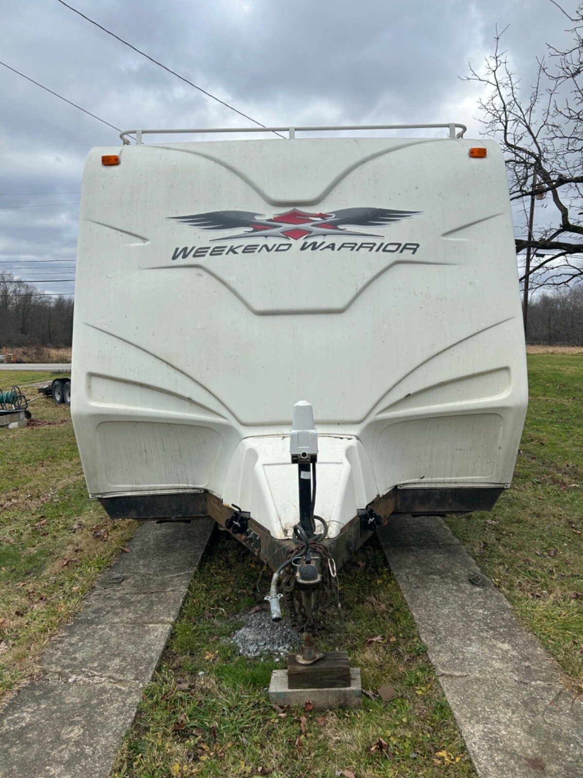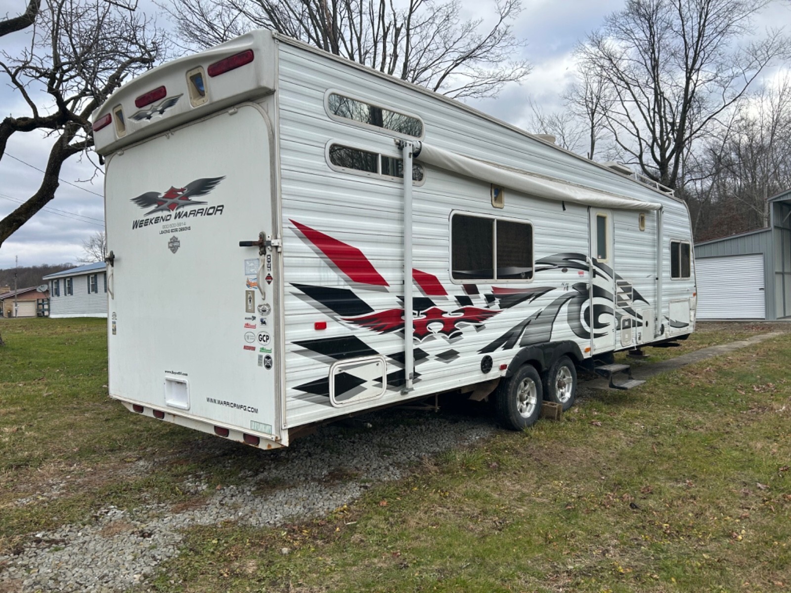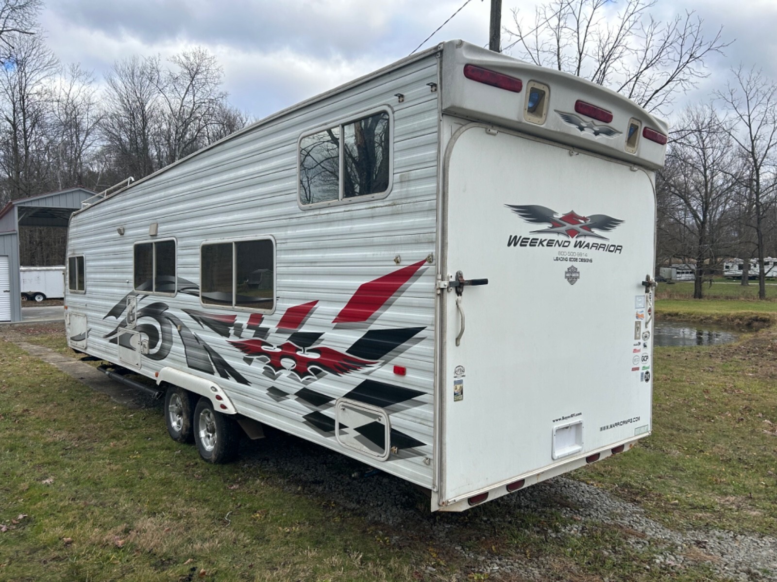 The 2007 Weekend Warrior FSC2800 is a travel trailer toy hauler, measuring32 feet long by 8'6" wide, with a dry weight of 5,875 lbs and an I-beam chassis with "Z" rail support. Key features include dual 6,000-pound axles, 16-inch tires and wheels, 150-gallon fresh water capacity, dual 58-gallon gray and black water tanks, dual propane bottles, and a 13,500 BTU ducted air conditioner. It is a self-contained unit with multiple tie-down plates, a one-piece fiberglass tub/shower, and a toilet. The only known issue with this Toy Hauler is the Awning needs repair or replaced.Dimensions and weight