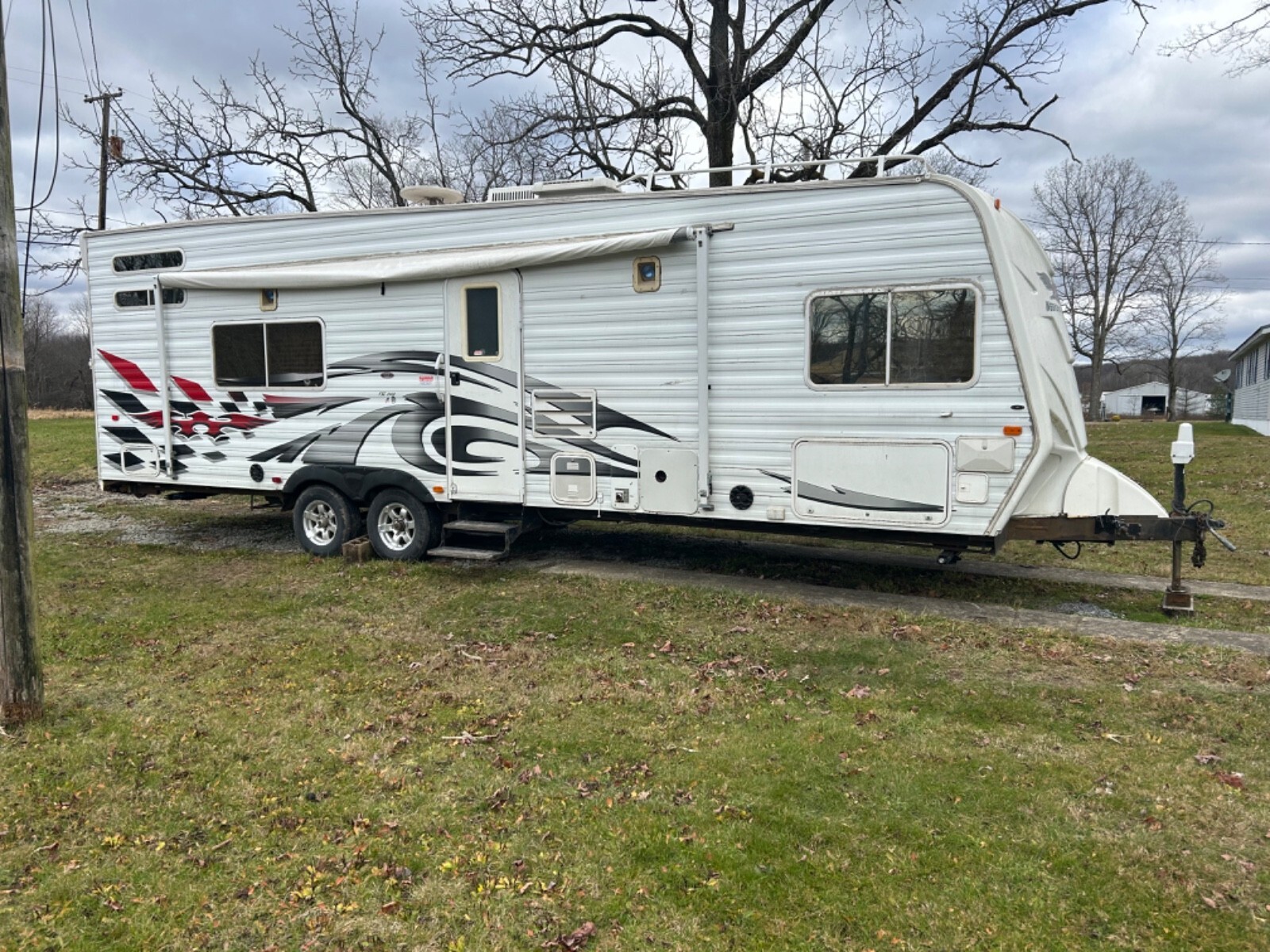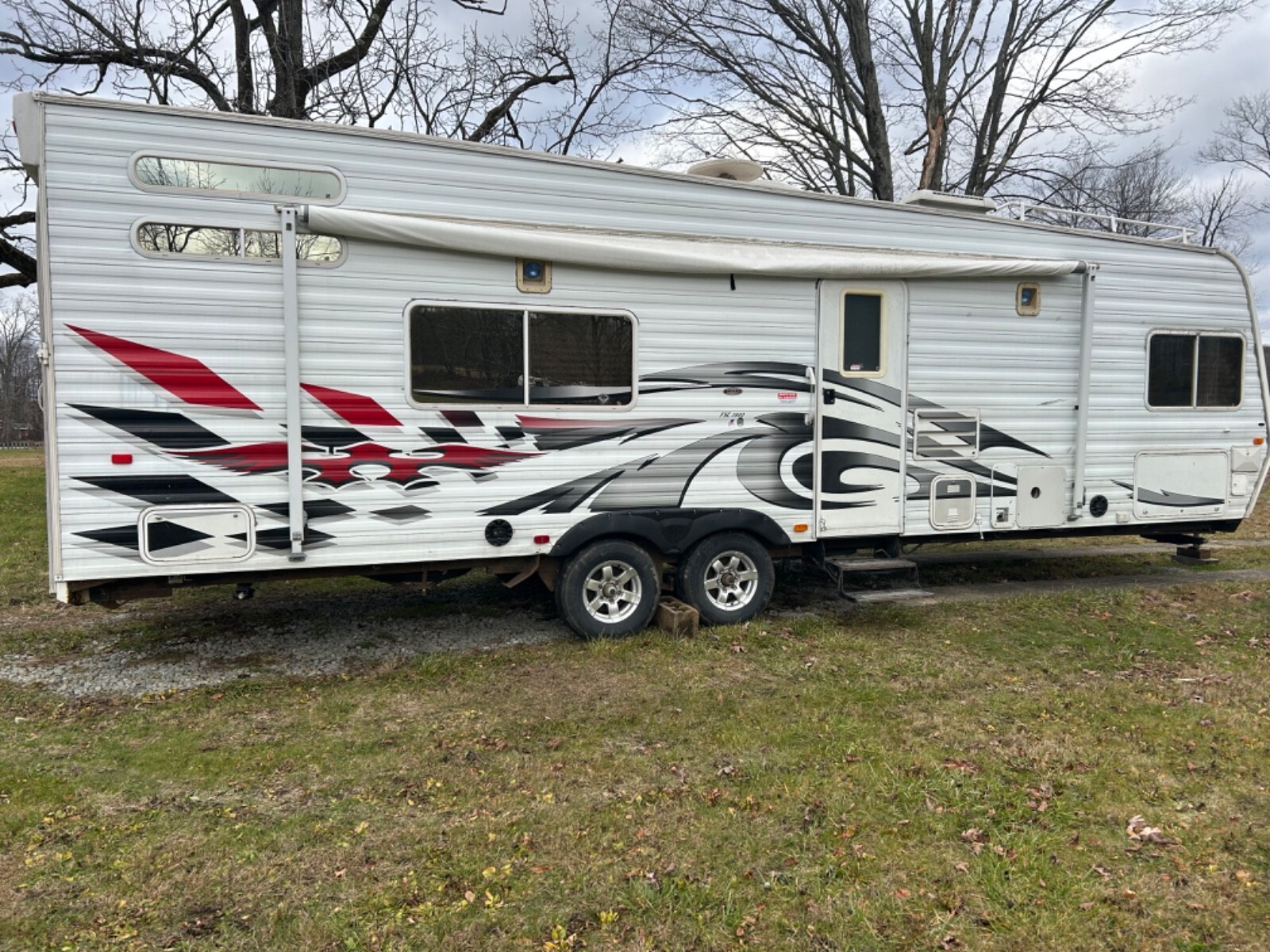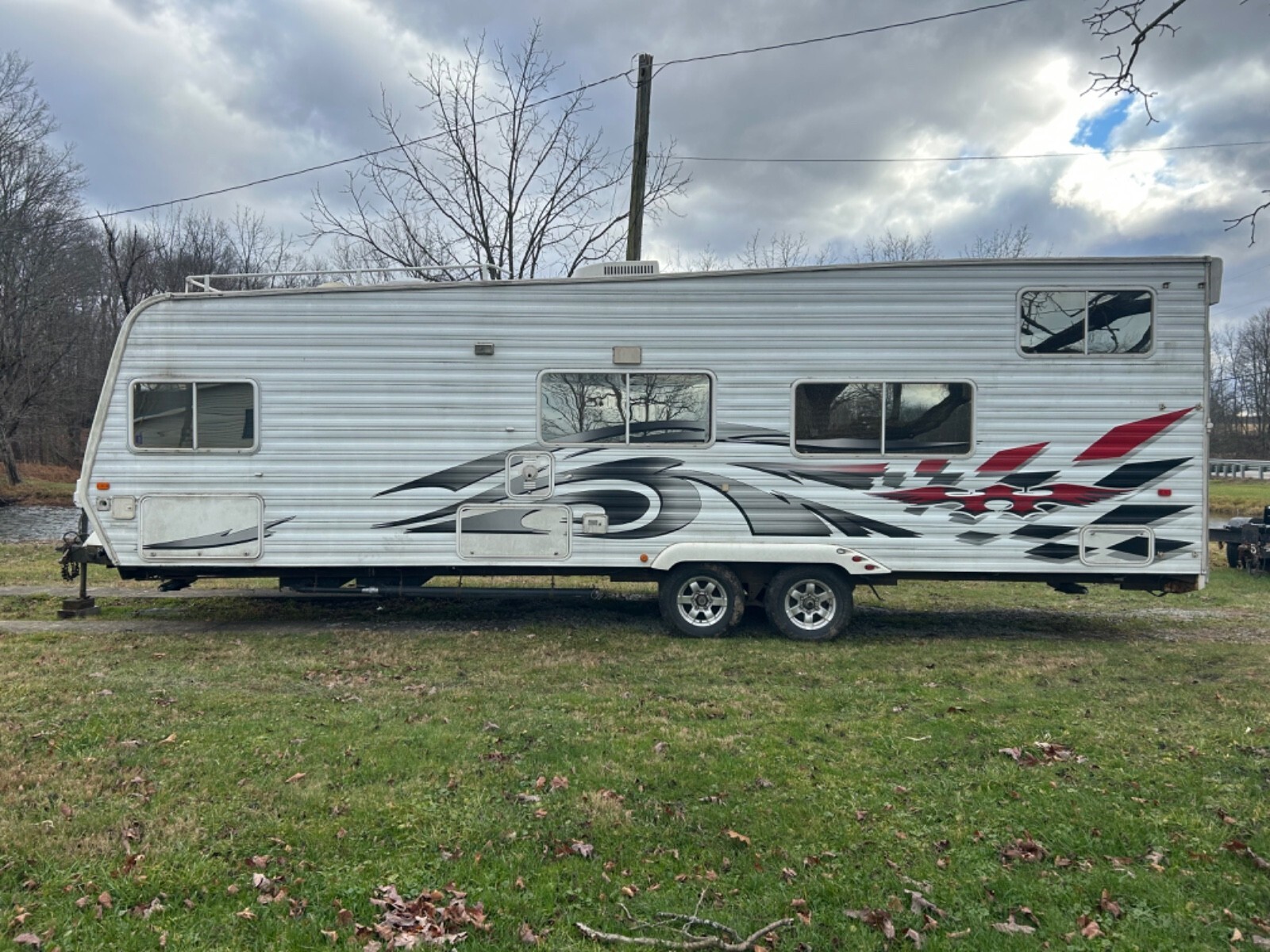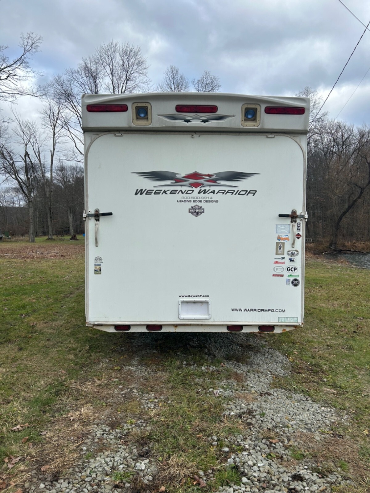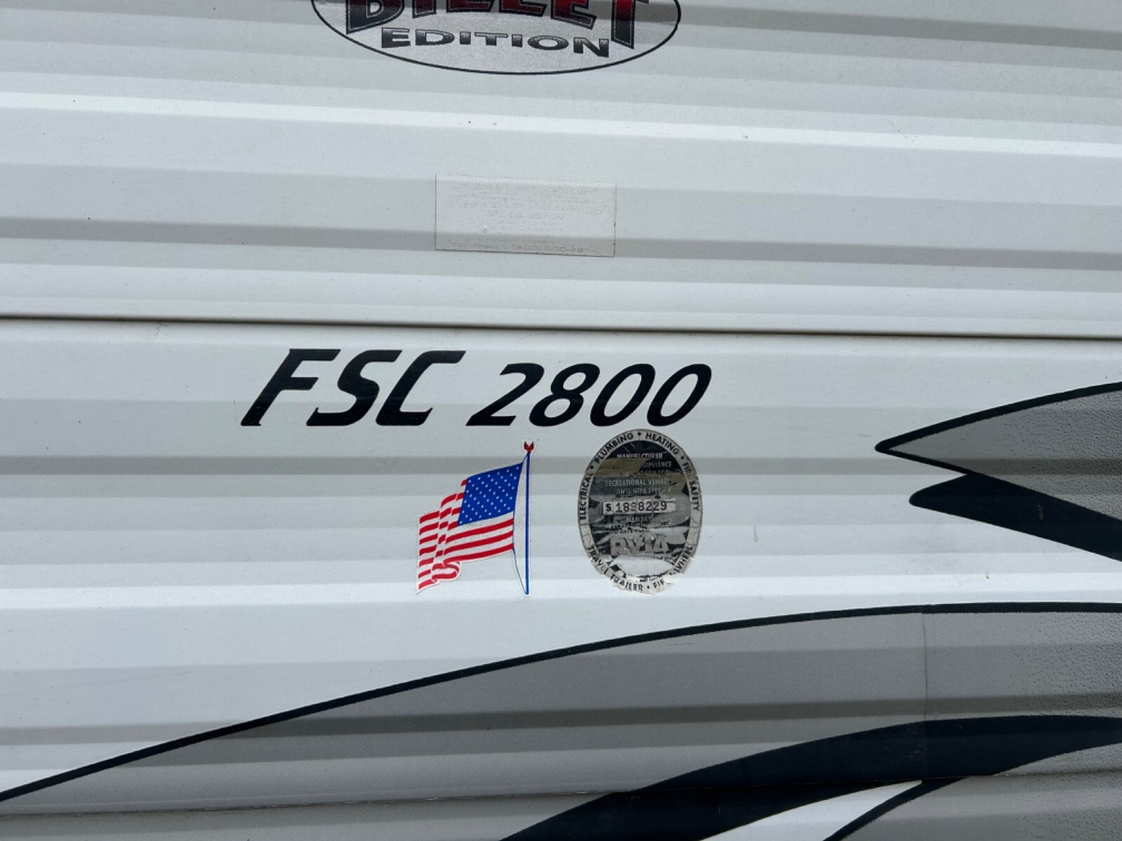 The 2007 Weekend Warrior FSC2800 is a travel trailer toy hauler, measuring32 feet long by 8'6" wide, with a dry weight of 5,875 lbs and an I-beam chassis with "Z" rail support. Key features include dual 6,000-pound axles, 16-inch tires and wheels, 150-gallon fresh water capacity, dual 58-gallon gray and black water tanks, dual propane bottles, and a 13,500 BTU ducted air conditioner. It is a self-contained unit with multiple tie-down plates, a one-piece fiberglass tub/shower, and a toilet. The only known issue with this Toy Hauler is the Awning needs repair or replaced.Dimensions and weight