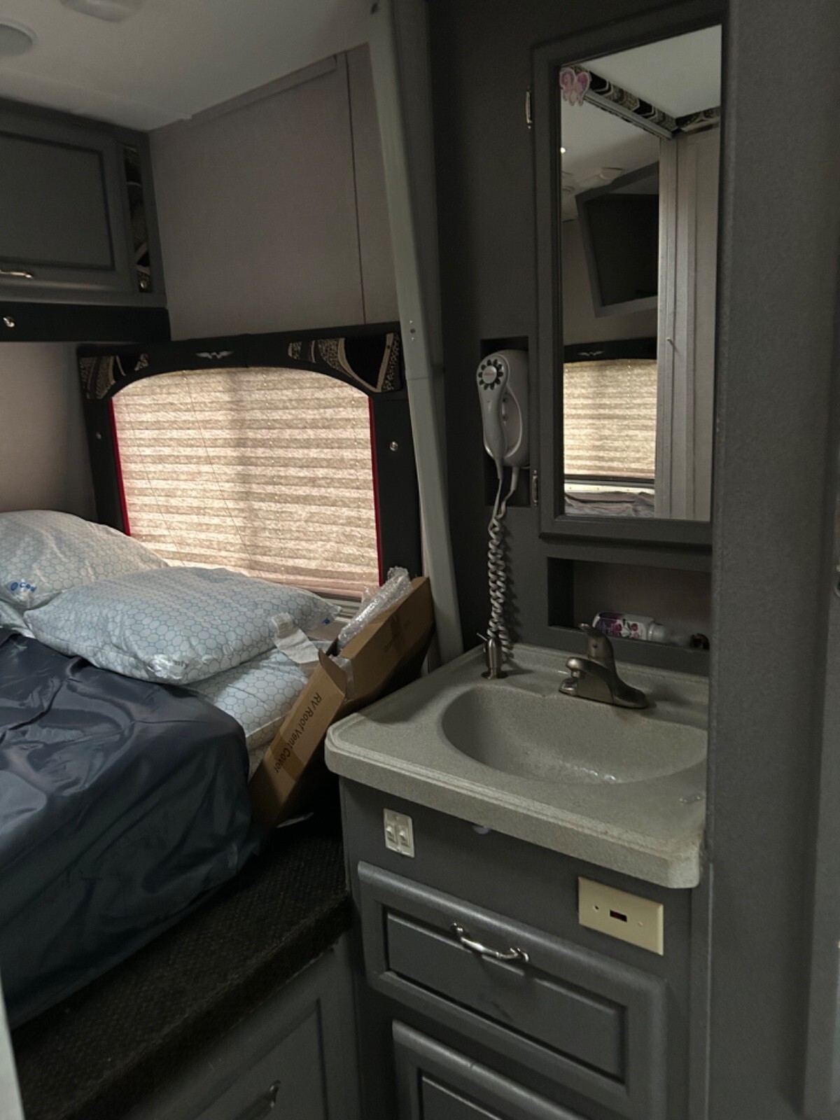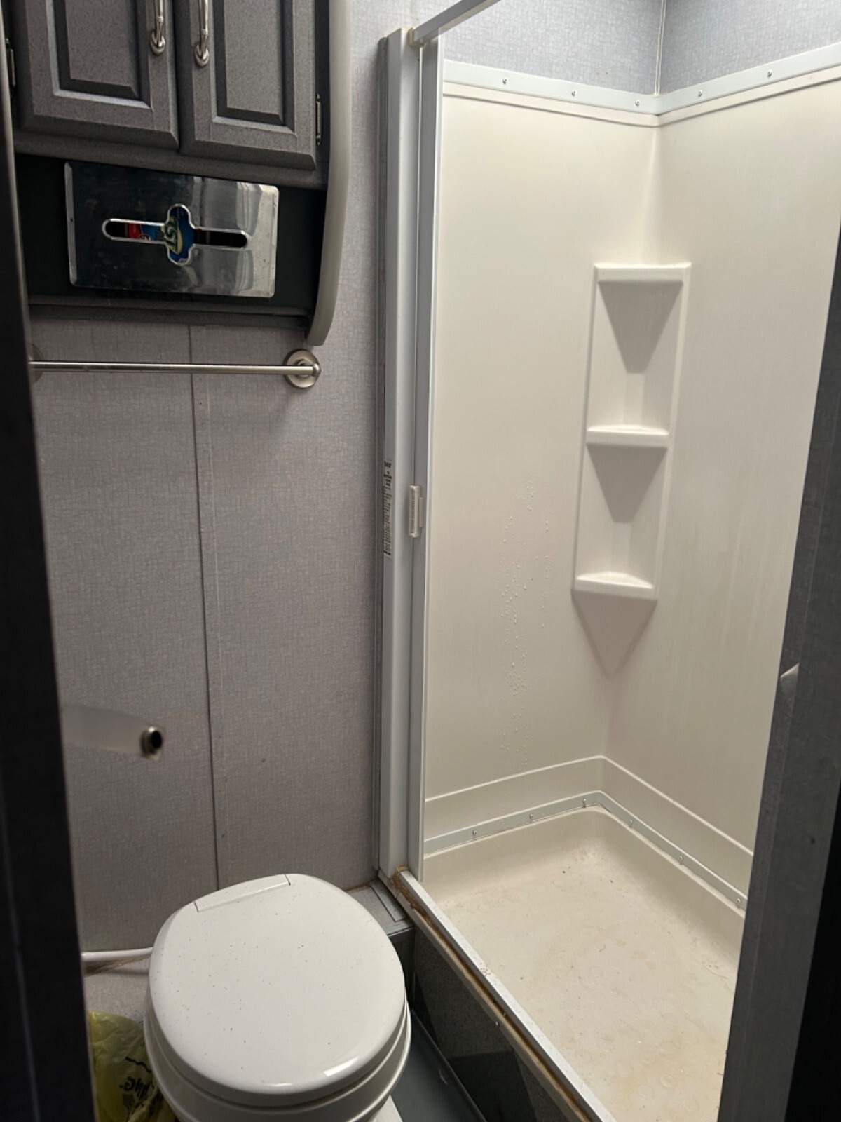 - Bathroom:One-piece fiberglass tub/shower and toilet with sprayer