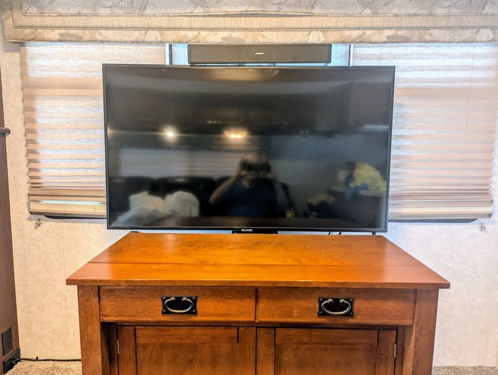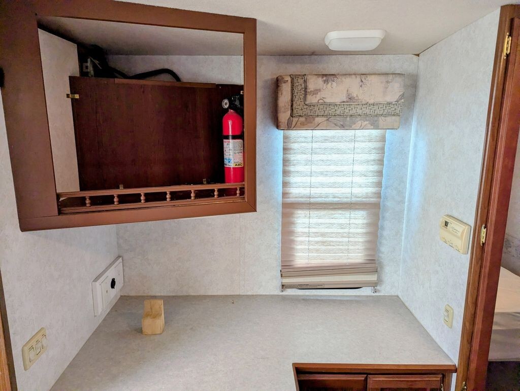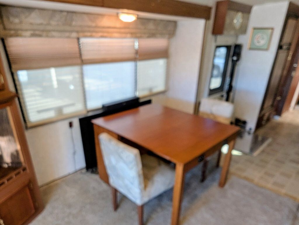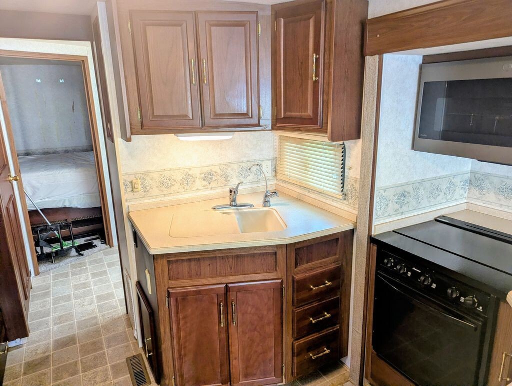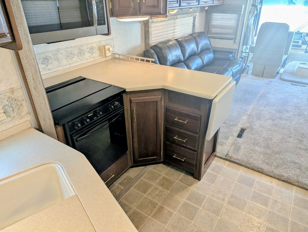 The kitchen has been thoughtfully refreshed and is fully equipped for life on the road. Youll find a large residential-style refrigerator with a new cooling unit, a new microwave/stove combo, ample cabinetry, and generous counter space. A washer/dryer combo adds everyday convenience, making long trips or full-time living effortless.