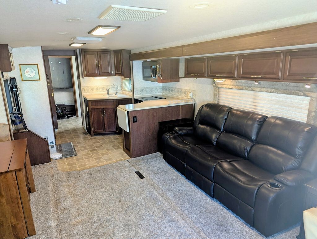 Step inside to a warm, upscale interior highlighted by new carpeting and a custom dining arrangement designed to comfortably seat 46 guestsperfect for entertaining or extended stays. The living area features a leather three-seat sofa with power loungers on both ends, positioned for optimal viewing of the 50 flat-screen TV, creating a relaxing, residential-style atmosphere.