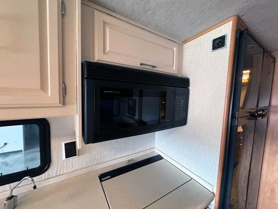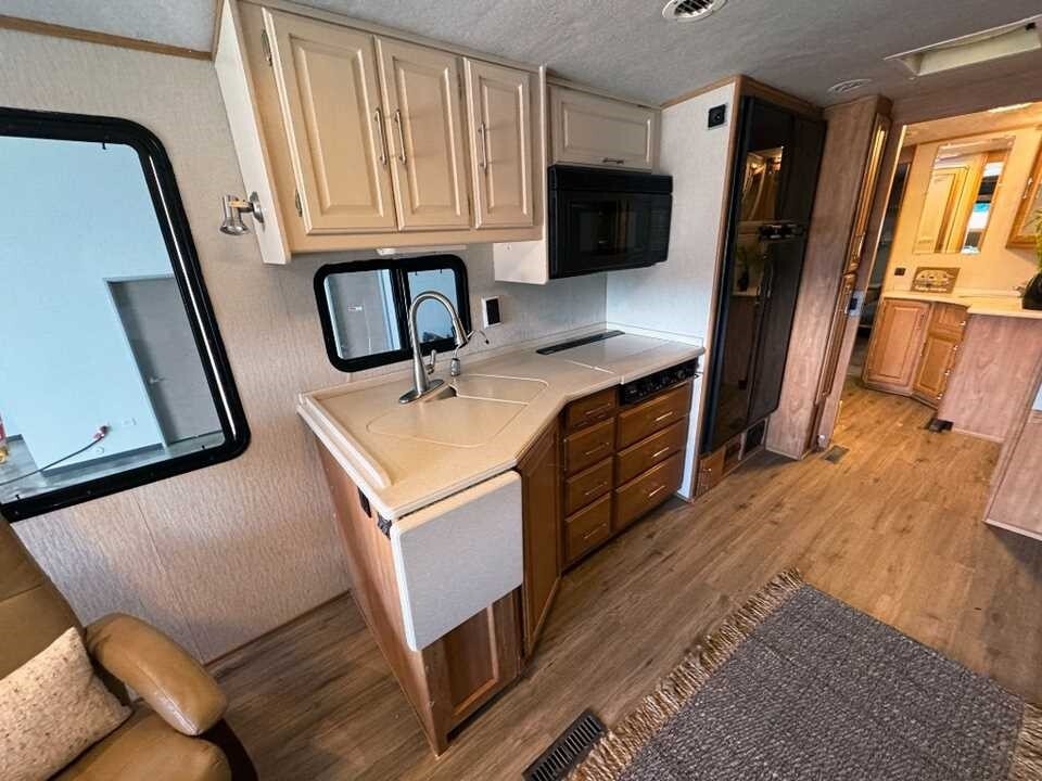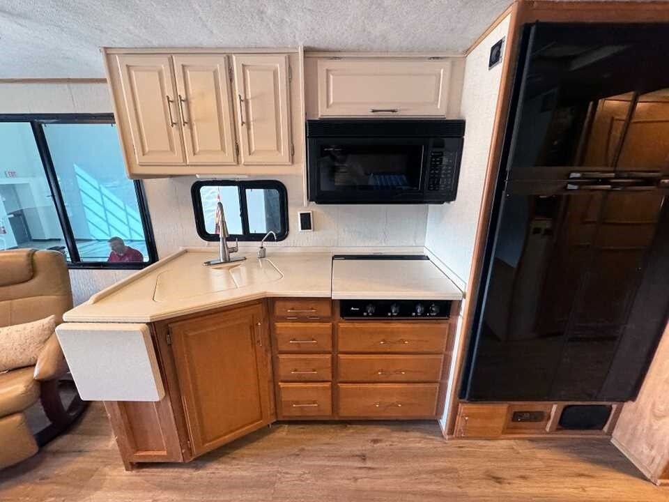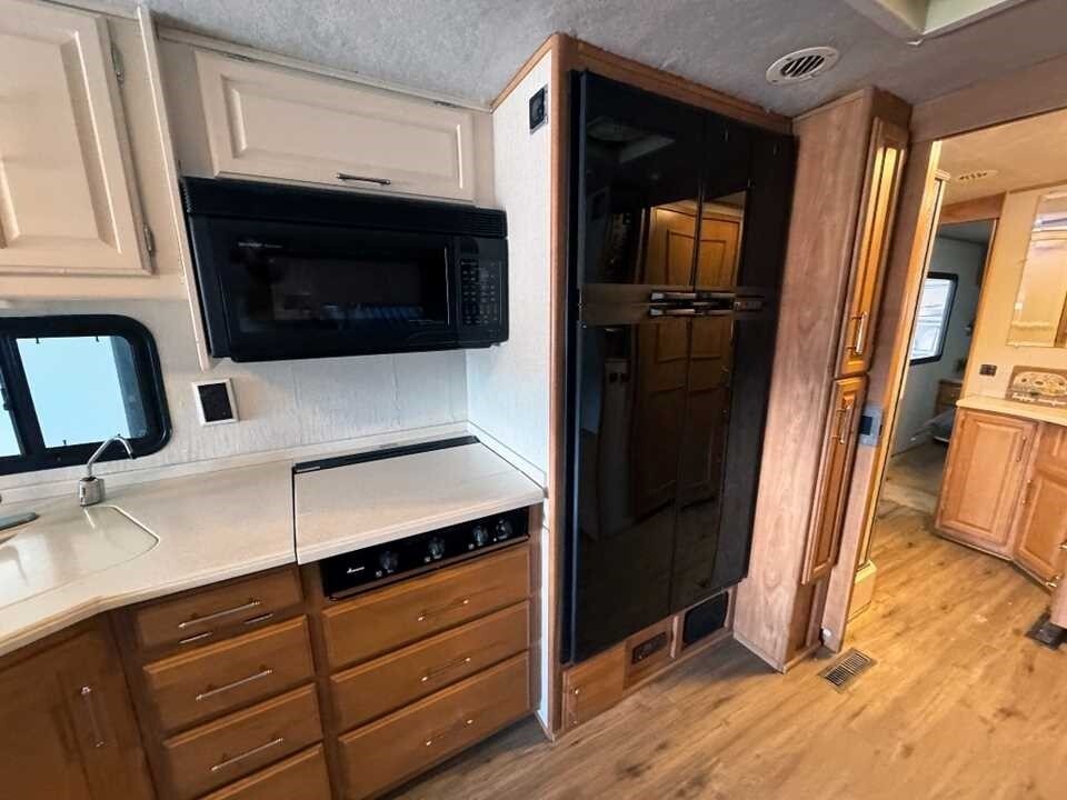 Full-Featured Kitchen: A spacious fridge, oven, microwave, and ample countertop space make preparing meals on the go a breeze.