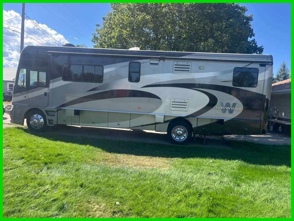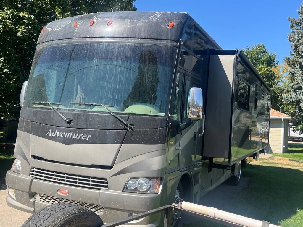 2008 Winnebago Adventurer Class A Motorhome This 2008 Winnebago Adventurer Class A motorhome measures 32 feet and is powered by a V10 gasoline engine with automatic transmission. Showing 84,400 miles, it features multiple slide-outs, spacious living and bedroom areas, full kitchen with convection microwave/oven, two-burner cooktop, and filtered water. Amenities include powered awnings, generator, solar panels, rear-view camera, leveling system, and ample storage. Recently fitted with new batteries and tires in good condition. VIN: 1F6NF53Y880A02936. Located in Big Timber, MT 59011 For more information, please call 833-265-6113 and mention ID 90678