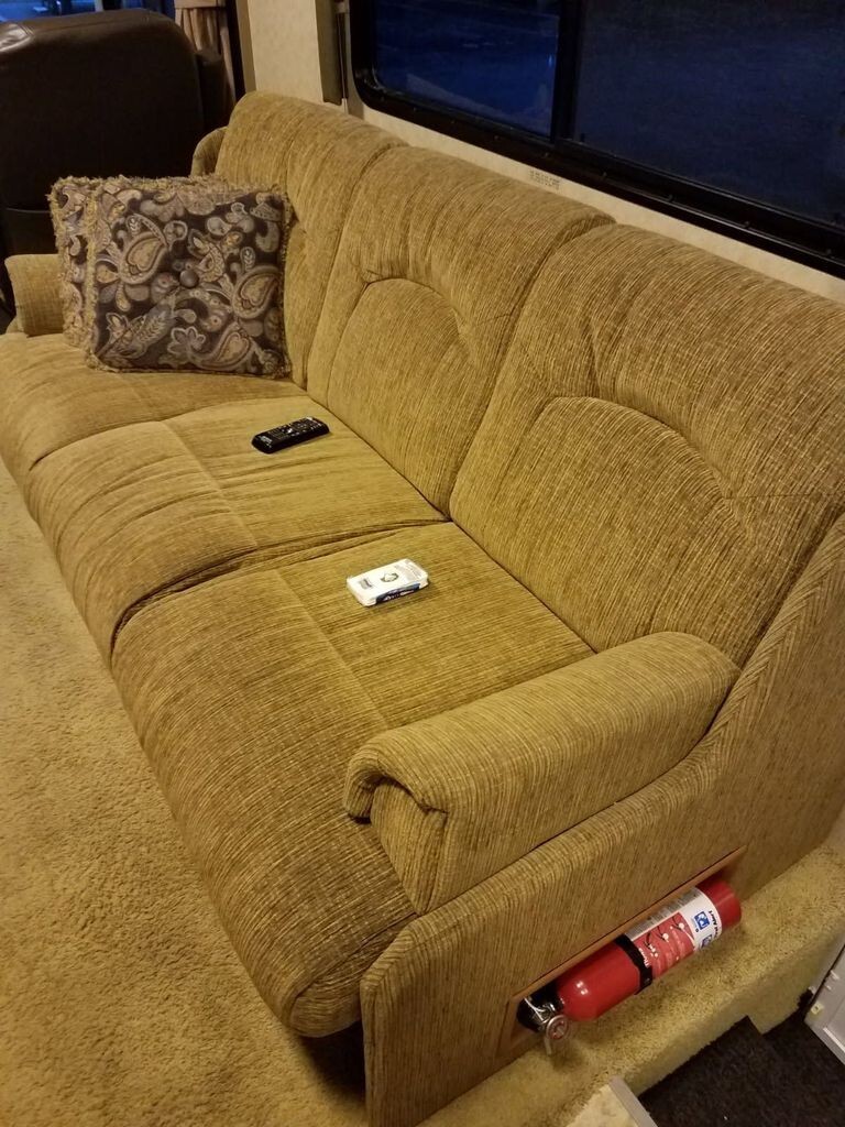 Inside, the living space offers a true residential feel with two TVs, a full home theater system (amplifier, DVD player, receiver, five speakers, and subwoofer), and a comfortable sofa sleeper for guests. The bedroom features a queen bed with a new mattress and pillow topper, ensuring restful nights wherever you travel.