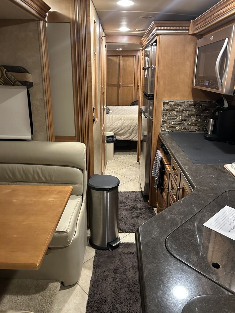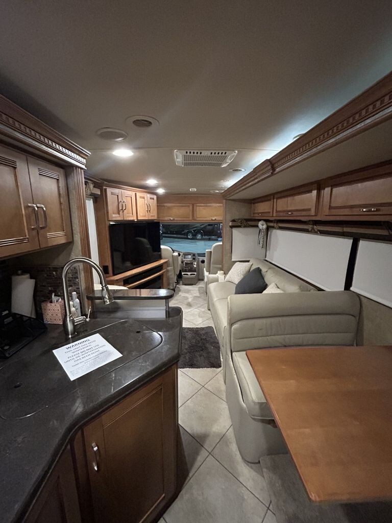 The gourmet-inspired kitchen boasts high-end appliances, solid-surface countertops, and abundant storage, making meal prep a pleasure whether youre on the road or parked at your favorite destination. Enjoy your meals at the dinette or unwind with a movie in the comfortable lounge area.