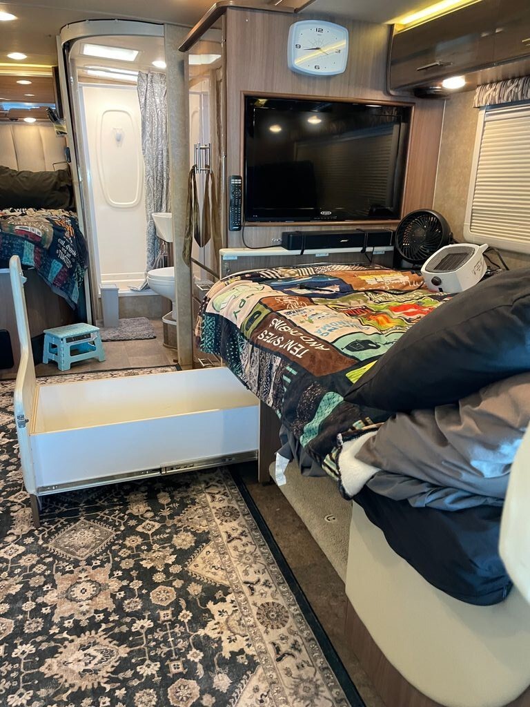 Custom beds built two custom storage units underneath front bed with 150 lb storage and sliders capacity each. It has the table option however we never used it - It also has a tankless water heater and has RV Navigation system.