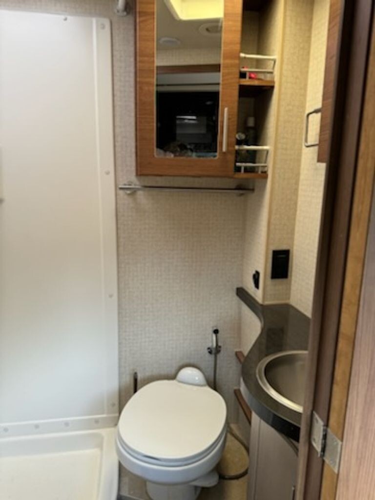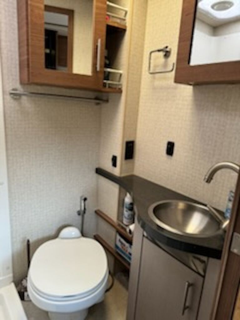 Sleep comfortably in the private rear bedroom, complete with a cozy bed and generous wardrobe storage. Additional sleeping options throughout the coach provide flexibility for guests or family members. The full bathroom adds convenience for longer trips without sacrificing comfort.
