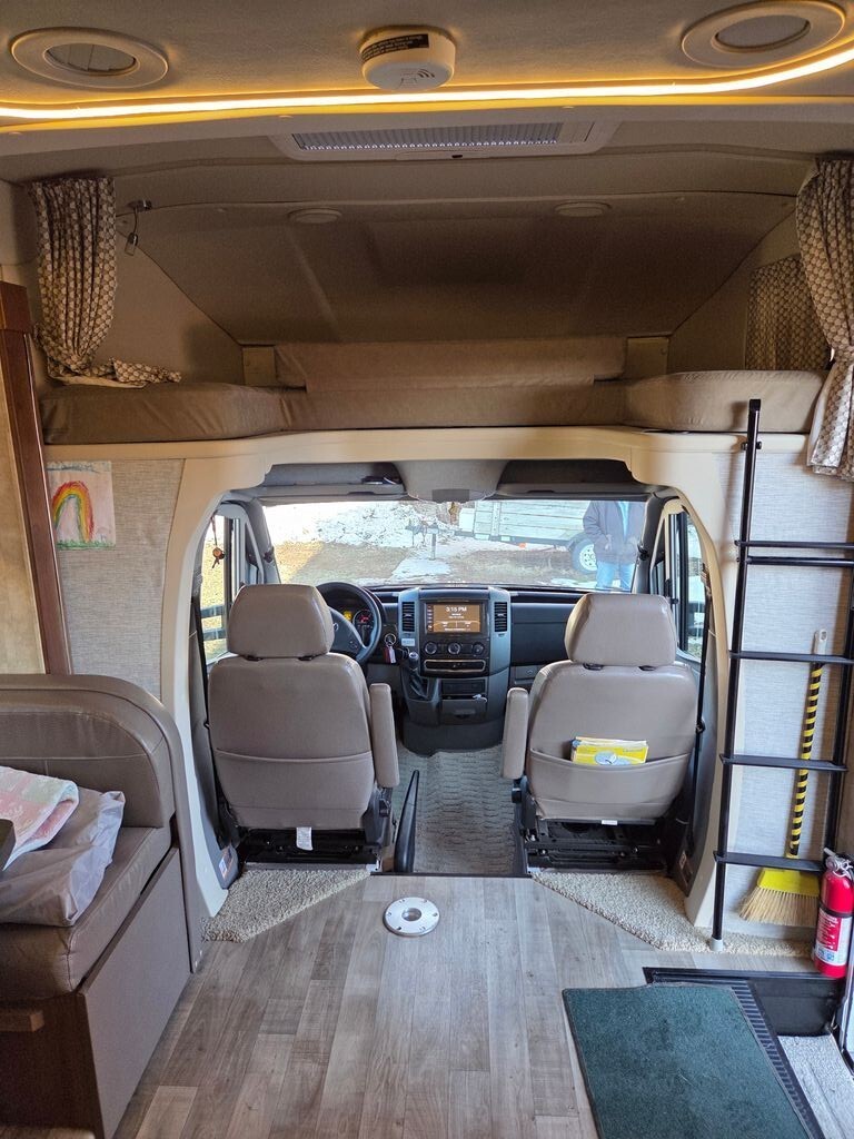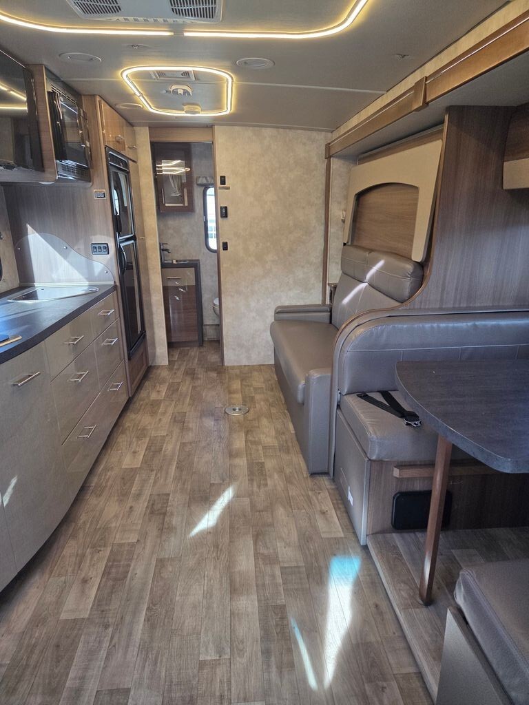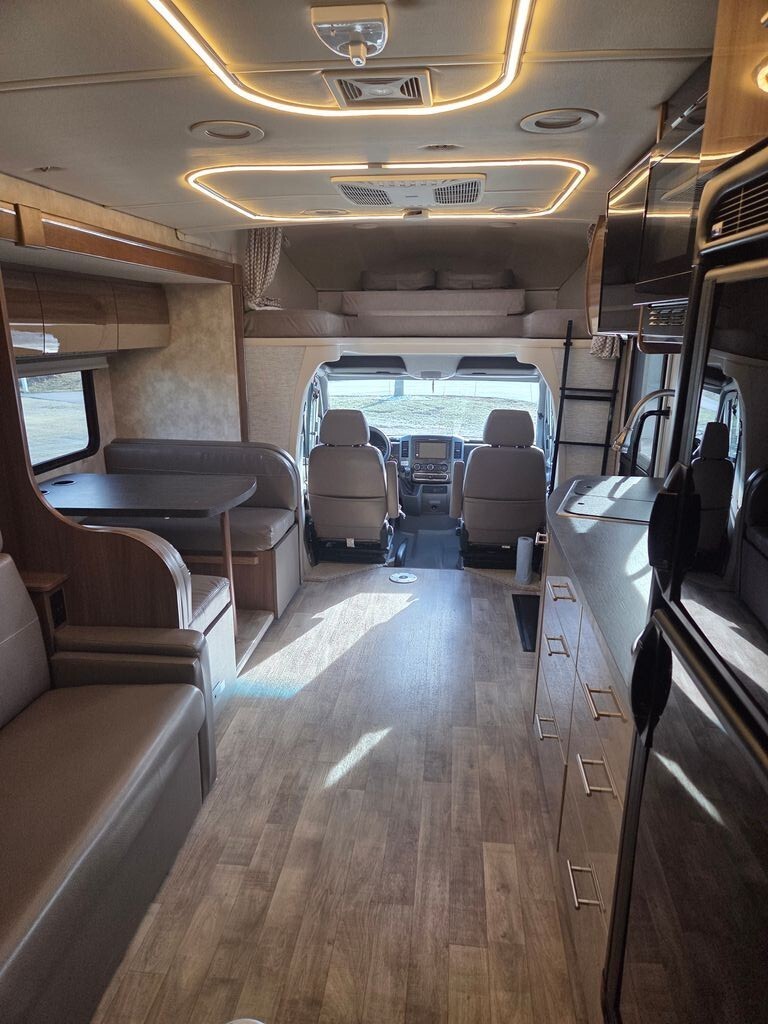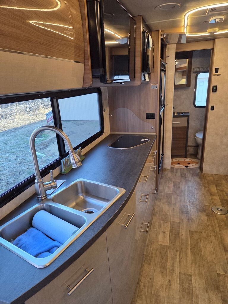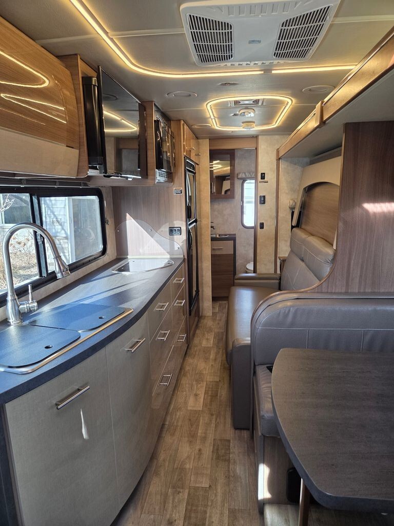 Step inside to an open and inviting living space where comfort meets functionality. The well-appointed interior includes plush seating, a flexible dinette, and large windows that flood the space with natural light - making it easy to relax, dine, or entertain after a day of exploring. The efficient kitchen features modern appliances, smart storage solutions, and plenty of counter space for meal prep on the road.