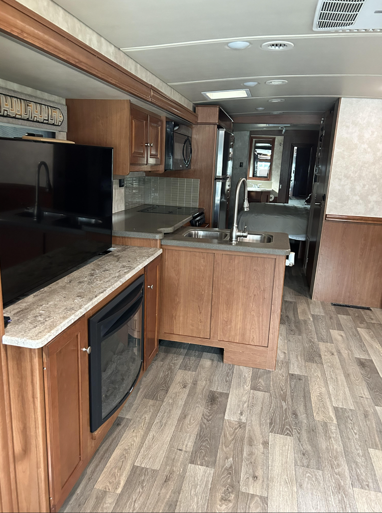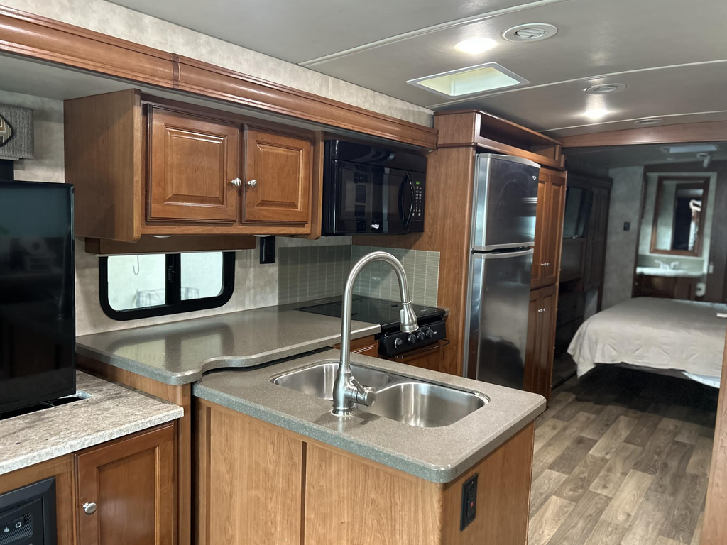 The chef-inspired kitchen is equally impressive, featuring a 3-burner cooktop, convection microwave, and a full residential refrigerator, giving you all the space and capability youd expect at home. Thoughtful storage and solid-surface countertops make meal prep effortless, whether youre cooking for two or the whole crew.