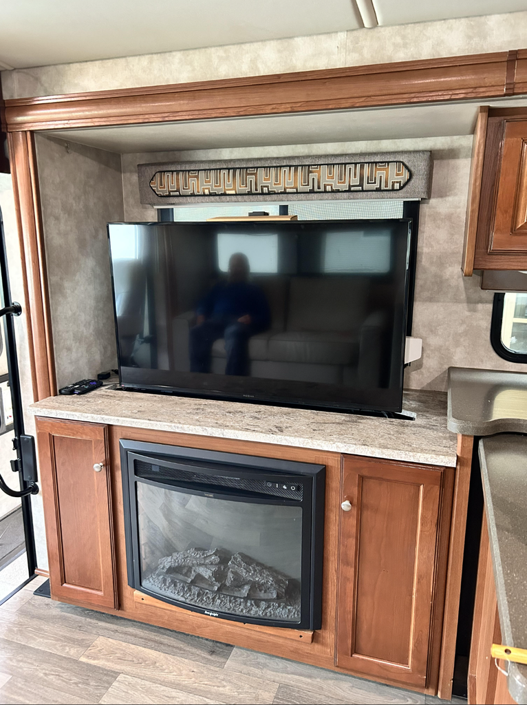 The spacious interior is made possible by three slideouts, including a massive mega slide, creating an open, residential feel thats perfect for extended stays or entertaining on the road. Plush seating, premium finishes, and a warm electric fireplace set the tone for relaxed evenings after a day of adventure.