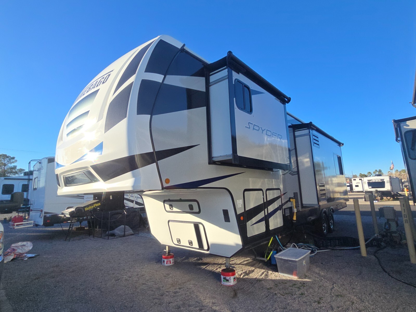 This is the rarely seen 2021 Winnebago Spyder 5th wheel toyhauler. Total length is 35.5". Great size and floorplan offering plenty of elbow room without being too big to fit in most RV parks. Its been great to me, I am the original owner, all works as expected, no problems, issues, leaks. If anything ever did break, I fixed it, or had an RV tech come and fix it. Its been very well maintained and kept clean. New brakes/wheel hubs just done in October 2025 as normal maintenance. New 14 ply tires in Spring of 2024. Less than 3000 miles on tires. Mostly local travel in Central CA on this set of tires with one 500 mile trip to Las Vegas November 2025. New toilet October 2025. Ive traveled full time in it with 2 large bird cages and 2 motorcycles. Garage size varies, due to the slide. The full width of approximately 8'2" is available from the slide back, which is 4'4" to the dovetail, 5'5" to the back. A width of 6'4" is available at 13'4" to the dovetail and 14'5" all the way to the back. I used the PitBull Trailer restraint system to hold my motorcycles without tiedowns and get the most use of the space. I love this RV, but I just bought a house and won't be using the RV any longer.