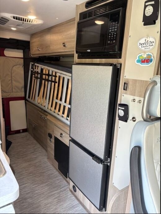 2022 Winnebago Travato 59G Class B RV For Sale in Wichita, KS 67235 This Travato is powered by a Pentastar VVT V6 engine and an automatic transmission with 36,500 miles. The overall length is 21 feet, and it comes equipped with 1 power retractable awning, 1 A/C unit, a generator, solar panels, and plenty of room to sleep 3. This unit has been well-maintained. Kitchen Area Features 2-Burner Induction Stovetop Microwave Overhead Fan Mid-Size Fridge/Freezer Sink & Faucet Pantry Livi