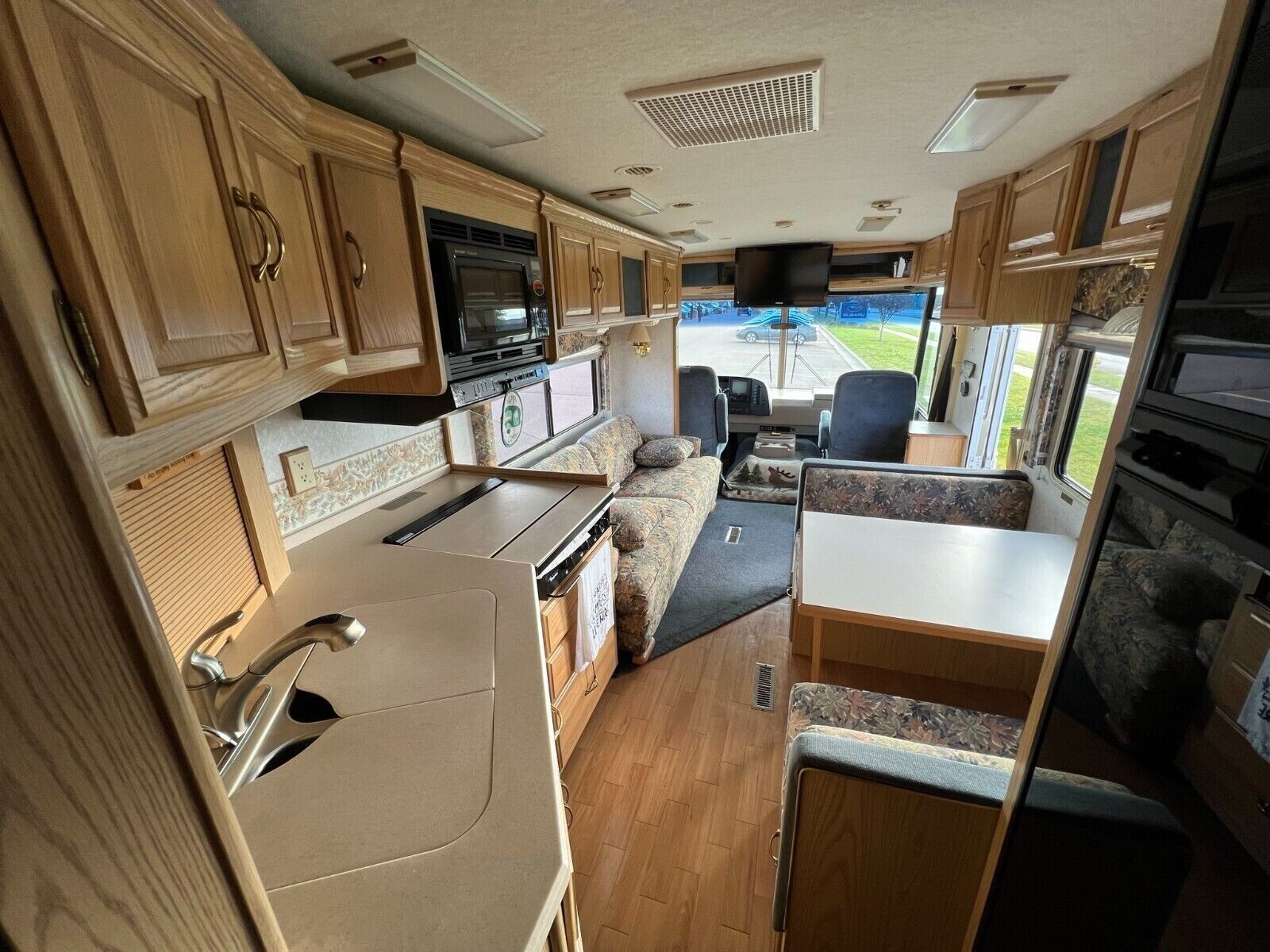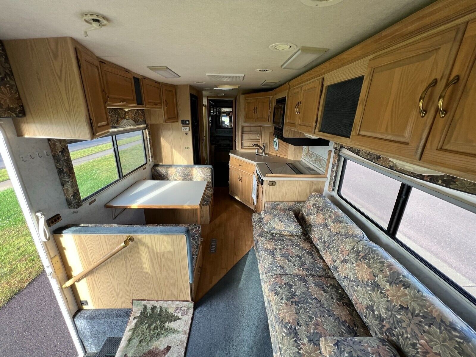 The Winnebago Chieftain 34Y motorhome is a spacious and equipped Class A RV that can comfortably sleep up to 4 people. The dining table also folds down to sleep an additional 2 smaller people or children. With a water capacity of 98 gallons, this RV is perfect for extended road trips or vacation camping. It comes with 2 air conditioners, 1 awning, and 2 slide outs for added convenience. With a length of 34' 6" and leveling jacks included, this 1999 model is a reliable and comfortable option for any road adventure. Comes with a queen size bed that is very comfortable, sofa that folds out into a bed, refrigerator/freezer that runs on electric or propane. Has shower and tub with skylight. Private toilet with sink, mirrors, medicine cabinet and storage. Has power cables for 30 or 50 amp hookups and fresh water line for hooking up city water. 7,000 watt onboard Onan Generator with only 67.8 hours of run time. Made in the United States, this RV also runs on gas, making it a convenient and fuel-efficient choice.